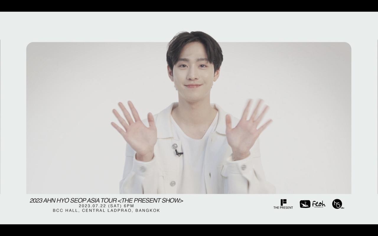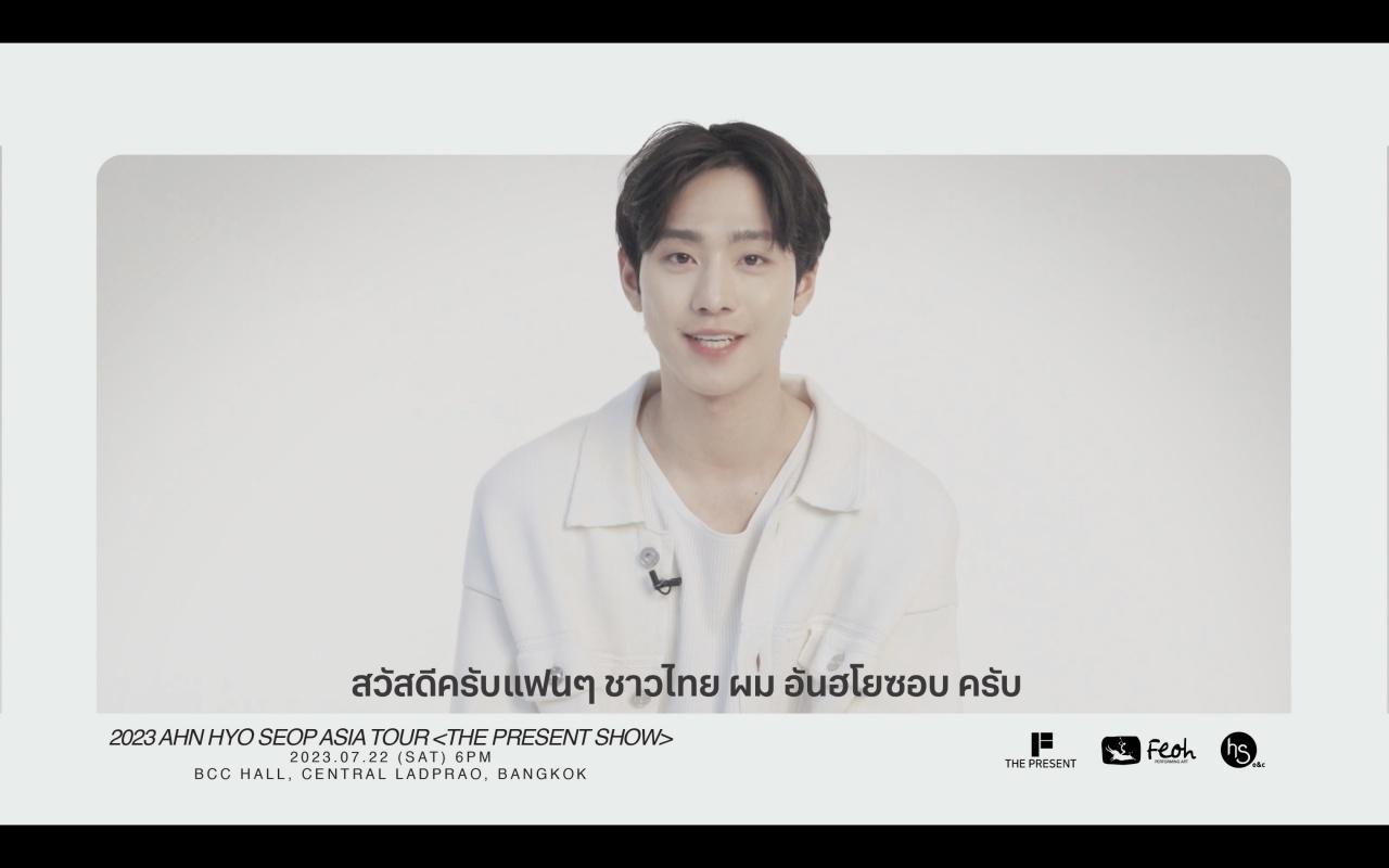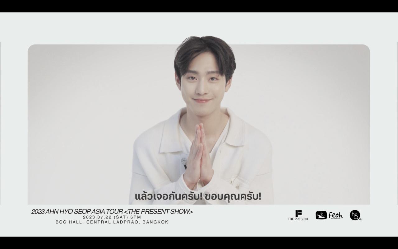 งานนี้ อันฮโยซอบ ส่งคลิปสุดอ้อนชวนแฟนทุกคนไปเจอกันในงาน 2023 อันฮโยซอบ เอเชีย ทัวร์ <เดอะ เพรสเซนต์ โชว์ อิน แบงคอก> “เฮียร์ แอนด์ นาว” (2023 AHN HYO SEOP ASIA TOUR <THE PRESENT SHOW in BANGKOK> “here and now”) วันเสาร์ที่ 22 กรกฎาคม 2566 ณ บีซีซี ฮอลล์ เซ็นทรัล พลาซ่า ลาดพร้าว ชั้น 5