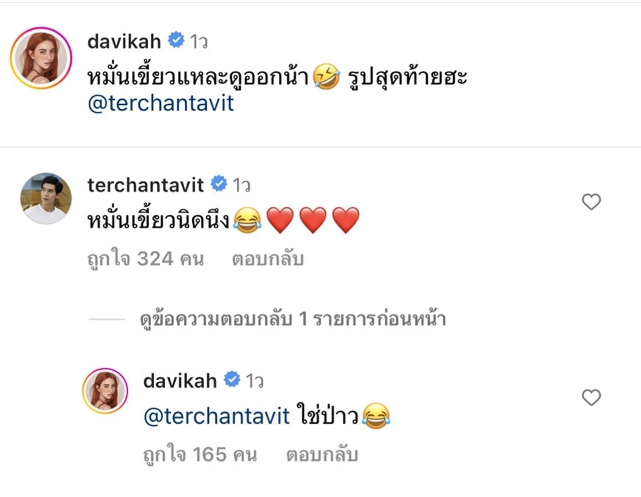 ล่าสุดเพื่อยืนยันความรักของ ลุงกับลิง ยังหวาน ใหม่ ได้โพสต์ภาพคู่ เต๋อ กลางไอจี ในโมเมนต์น่ารักๆ แบบมันเขี้ยว พร้อมเขียนข้อความว่า "หมั่นเขี้ยวแหละดูออกน้า รูปสุดท้ายฮะ @terchantavit" ด้าน เต๋อ ก็ได้เข้ามาตอบว่า "หมั่นเขี้ยวนิดนึง"