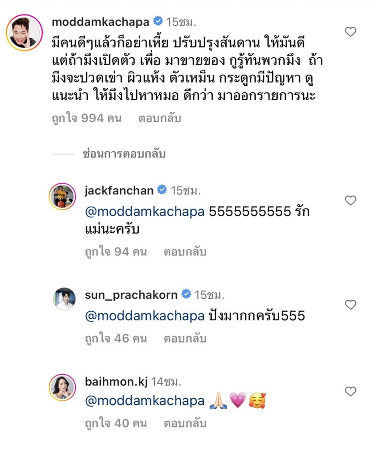 ด้านพี่คนสนิทอย่าง มดดำ คชาภา ที่ แจ็ค แฟนฉัน เคารพนับถืออย่างมาก ได้เข้ามาคอมเมนต์เตือน พร้อมอวยพรน้องชายสุดที่รักว่า