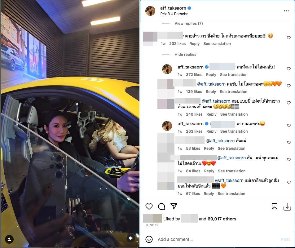 และเมื่อวันที่ 19 มิ.ย. 2566 ที่ผ่านมา ก็มีกระแสฮือฮาเมื่อ แอฟ ทักษอร โพสต์คลิปไปร่วมงานรถหรูปอร์เช่ ซึ่งแอฟขึ้นไปลองขับรถปอร์เช่ด้วยตัวเอง ก่อนจะพาเพื่อนสาวคนสวยไปนั่งเบาะข้างๆ และเพื่อนคนนี้ก็เข้ามาคอมเมนต์ใต้คลิปว่า “ตายล้าวววว ซิ่งด้วย โสดด้วยหรอคะเนี่ยยยย!!!” และใส่อีโมจิแลบลิ้น