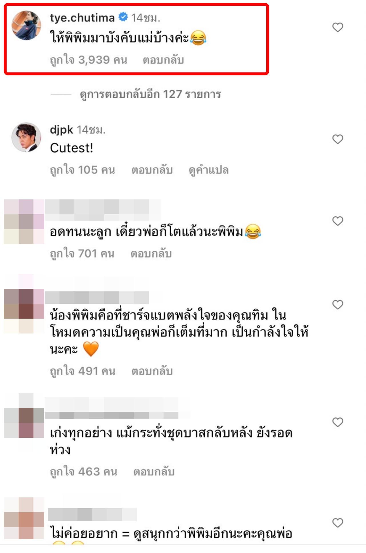 ด้าน แม่ต่าย ชุติมา ก็ได้เข้ามาคอมเมนต์ในโพสต์ดังกล่าวว่า "ให้พิพิมมาบังคับแม่บ้างค่ะ" งานนี้แฟนๆ ที่ติดตามได้เข้ามากดไลค์กันจำนวนมาก พร้อมกับเชียร์อยากเห็น 3 คนพ่อแม่ลูกไปทำกิจกรรมด้วยกัน.