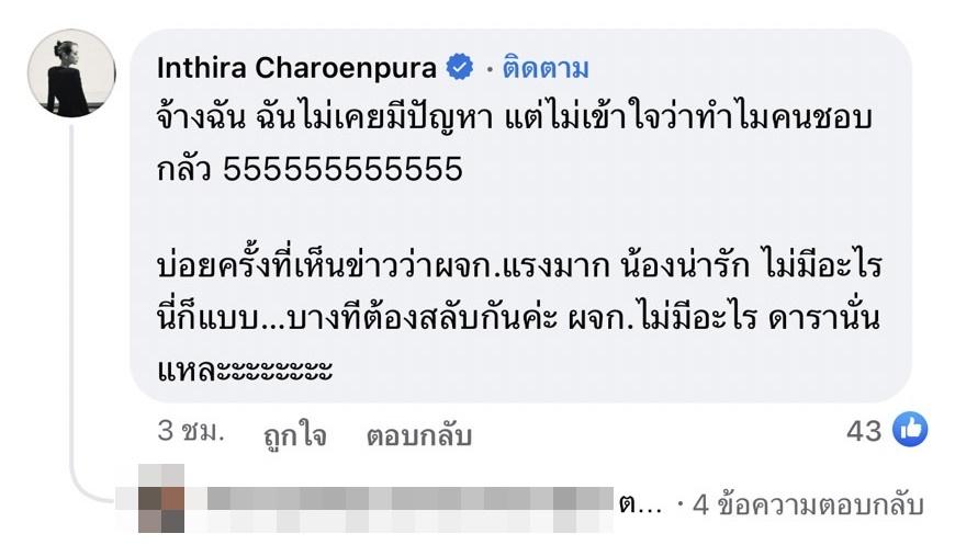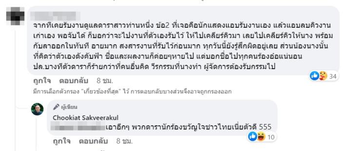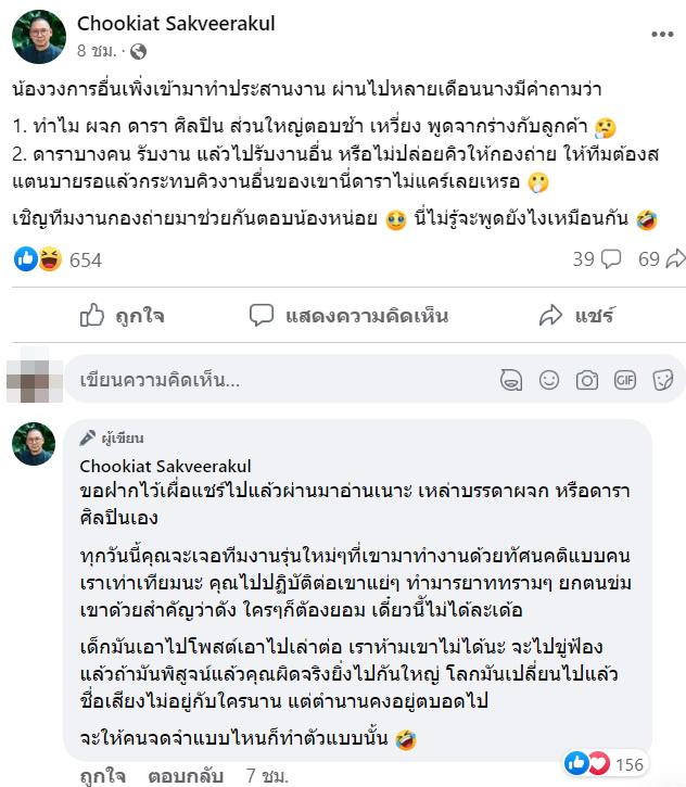 ก่อนจะโพสต์ข้อความในคอมเมนต์เพิ่มเติมว่า “ขอฝากไว้เผื่อแชร์ไปแล้วผ่านมาอ่านเนาะ เหล่าบรรดา ผจก. หรือดาราศิลปินเอง ทุกวันนี้คุณจะเจอทีมงานรุ่นใหม่ๆ ที่เขามาทำงานด้วยทัศนคติแบบคนเราเท่าเทียมนะ คุณไปปฏิบัติต่อเขาแย่ๆ ทำมารยาททรามๆ ยกตนข่มเขาด้วยสำคัญว่าดัง ใครๆ ก็ต้องยอม เดี๋ยวนี้ไม่ได้ละเด้อ เด็กมันเอาไปโพสต์เอาไปเล่าต่อ เราห้ามเขาไม่ได้นะ จะไปขู่ฟ้องแล้วถ้ามันพิสูจน์แล้วคุณผิดจริงยิ่งไปกันใหญ่ โลกมันเปลี่ยนไปแล้ว ชื่อเสียงไม่อยู่กับใครนาน แต่ตำนานคงอยู่ตลอดไป จะให้คนจดจำแบบไหนก็ทำตัวแบบนั้น”