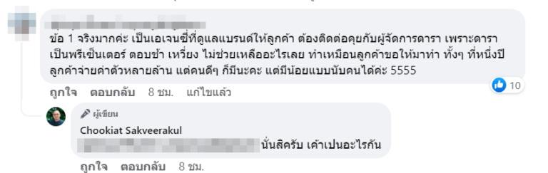 นอกจากนี้ยังมีคนแสดงความคิดเห็น “ข้อ 1 จริงมากค่ะ เป็นเอเจนซี่ที่ดูแลแบรนด์ให้ลูกค้า ต้องติดต่อคุยกับผู้จัดการดารา เพราะดาราเป็นพรีเซนเตอร์ ตอบช้า เหวี่ยง ไม่ช่วยเหลืออะไรเลย ทำเหมือนลูกค้าขอให้มาทำ ทั้งๆ ที่หนึ่งปีลูกค้าจ่ายค่าตัวหลายล้าน แต่คนดีๆ ก็มีนะคะ แต่มีน้อยแบบนับคนได้ค่ะ 5555”
