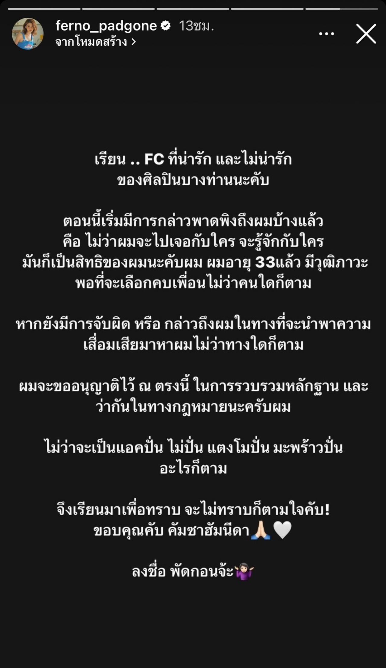 "เรียน .. FC ที่น่ารัก และไม่น่ารัก ของศิลปินบางท่านนะครับ ตอนนี้เริ่มมีการกล่าวพาดพิงถึงผมบ้างแล้ว คือไม่ว่าผมจะไปเจอกับใคร จะรู้จักกับใคร มันก็เป็นสิทธิของผมนะครับผม ผมอายุ 33 แล้ว มีวุฒิภาวะพอที่จะเลือกคบเพื่อน ไม่ว่าคนใดก็ตาม