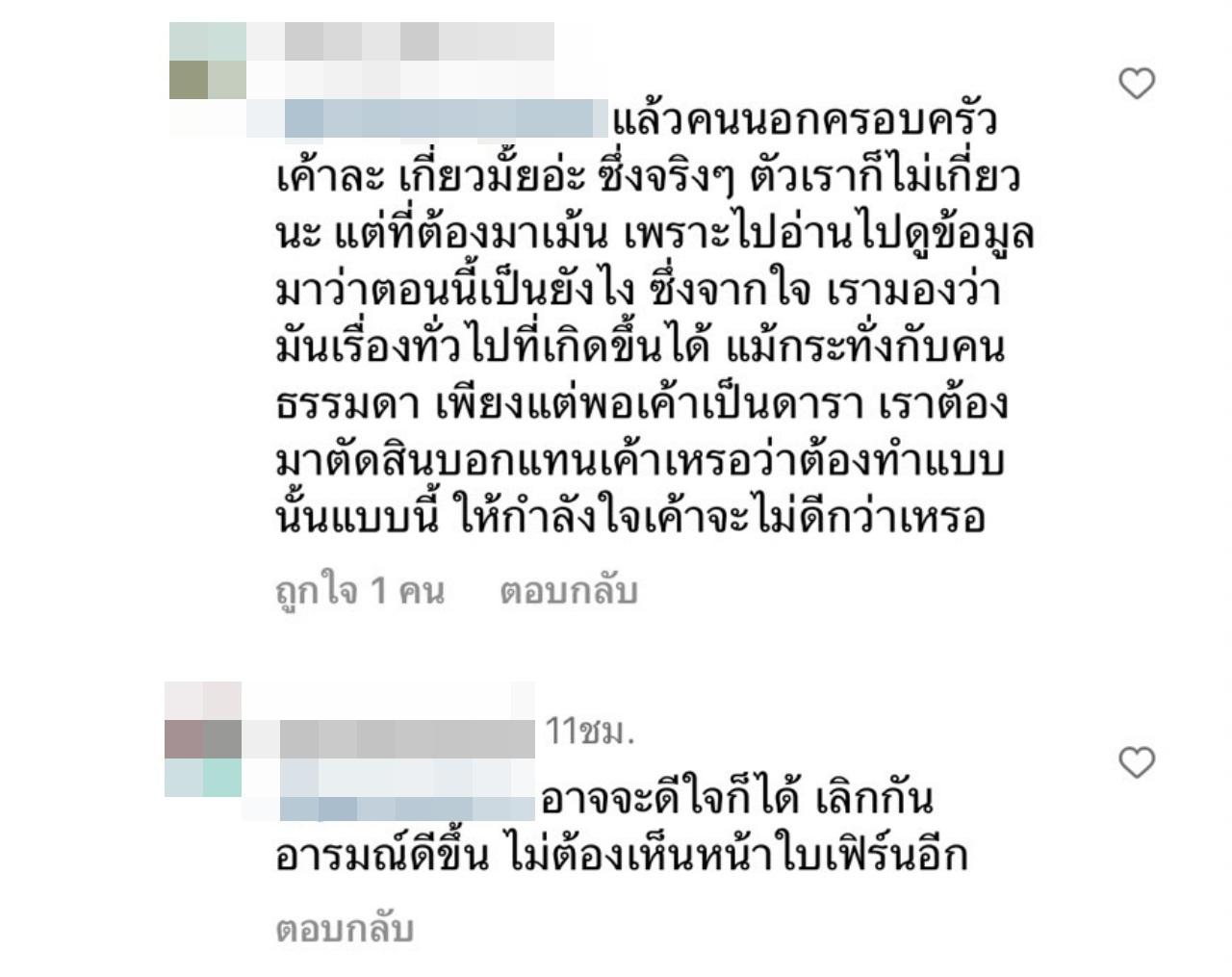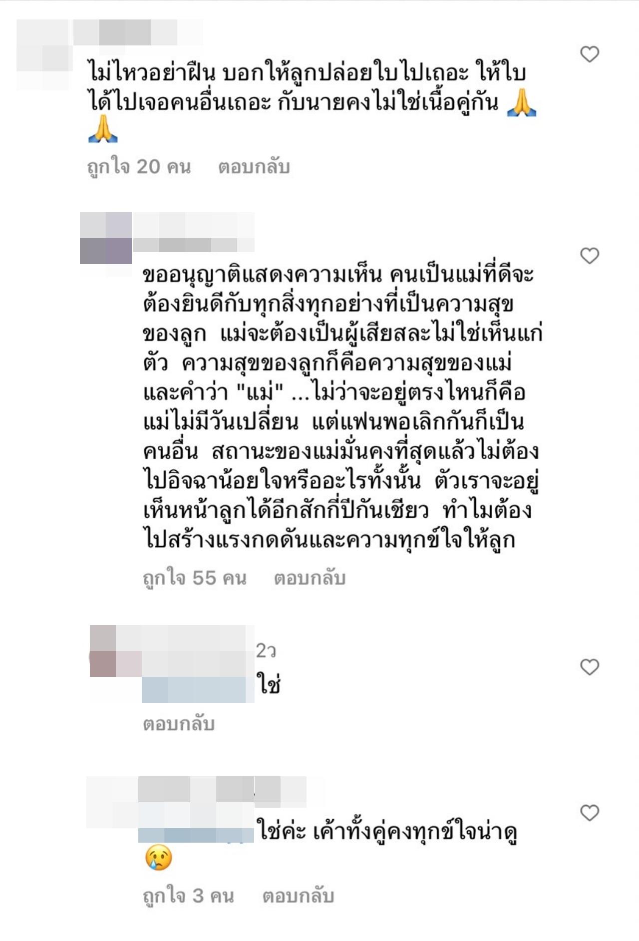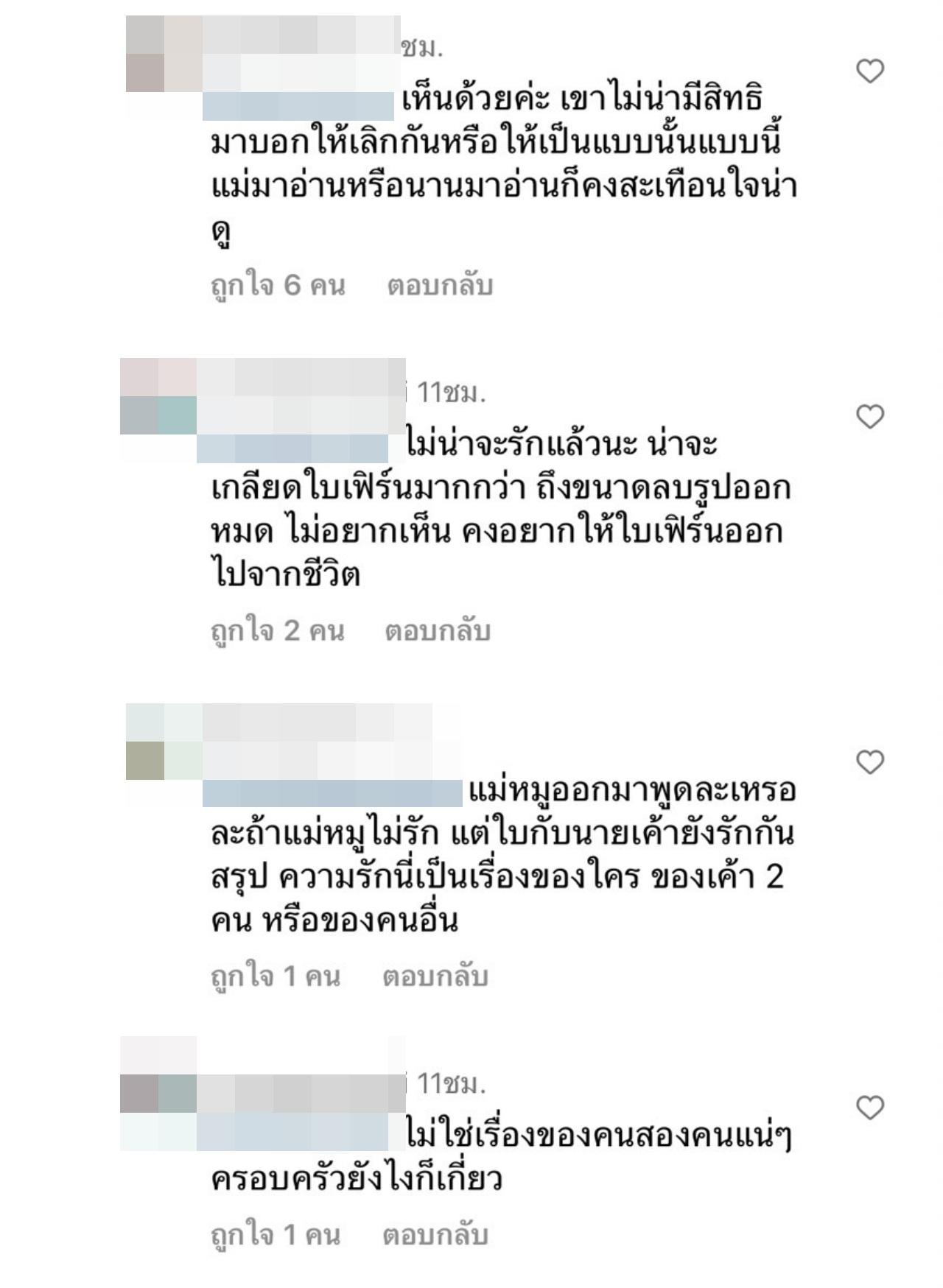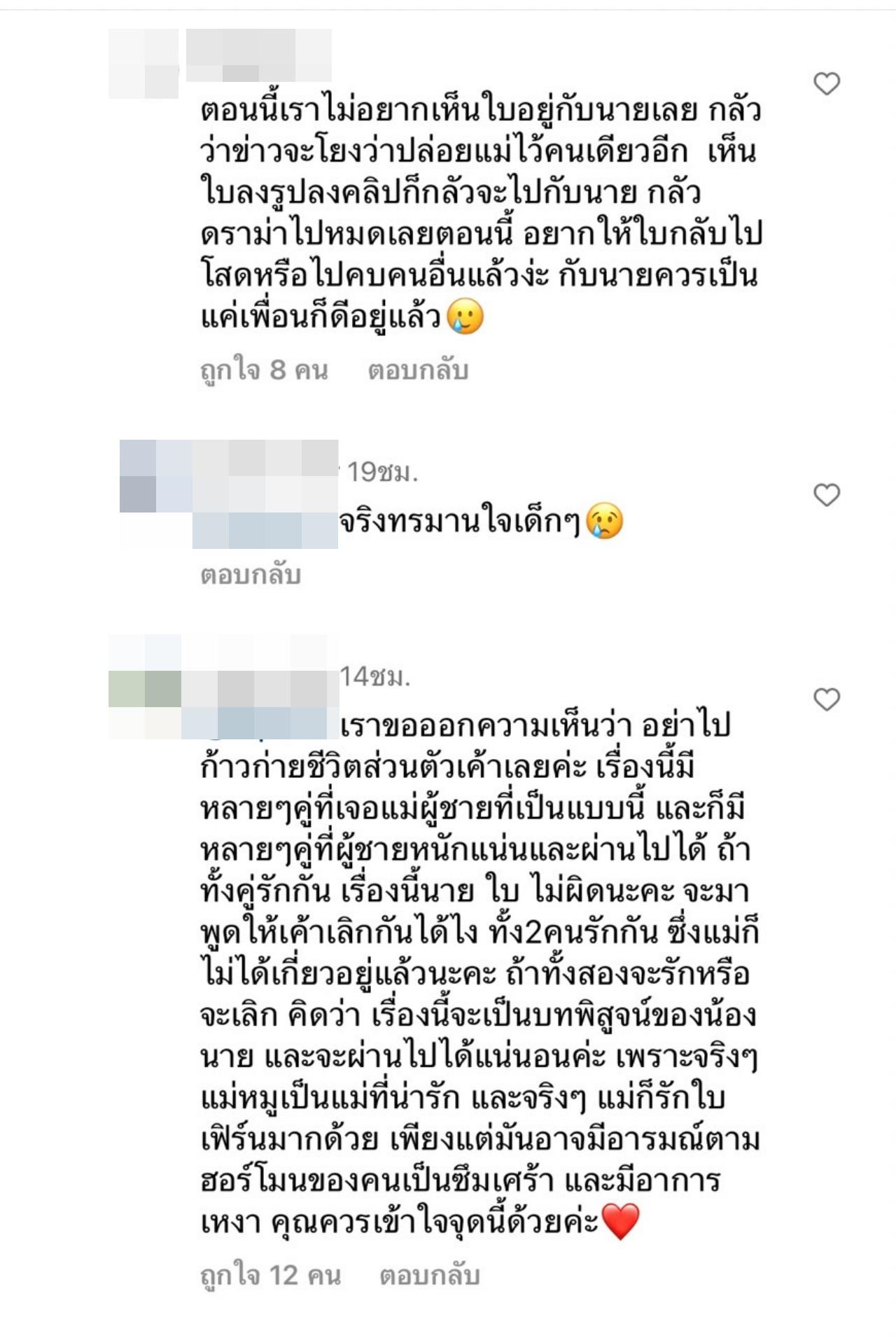 และยังได้เข้ามาคอมเมนต์กันเพิ่มเติมว่า "ตอนนี้เราไม่อยากเห็นใบอยู่กับนายเลย กลัวว่าข่าวจะโยงว่าปล่อยแม่ไว้คนเดียวอีก เห็นใบลงรูปลงคลิปก็กลัวจะไปกับนาย กลัวดราม่าไปหมดเลยตอนนี้ อยากให้ใบกลับไปโสดหรือไปคบคนอื่นแล้วง่ะ กับนายควรเป็นแค่เพื่อนก็ดีอยู่แล้ว",