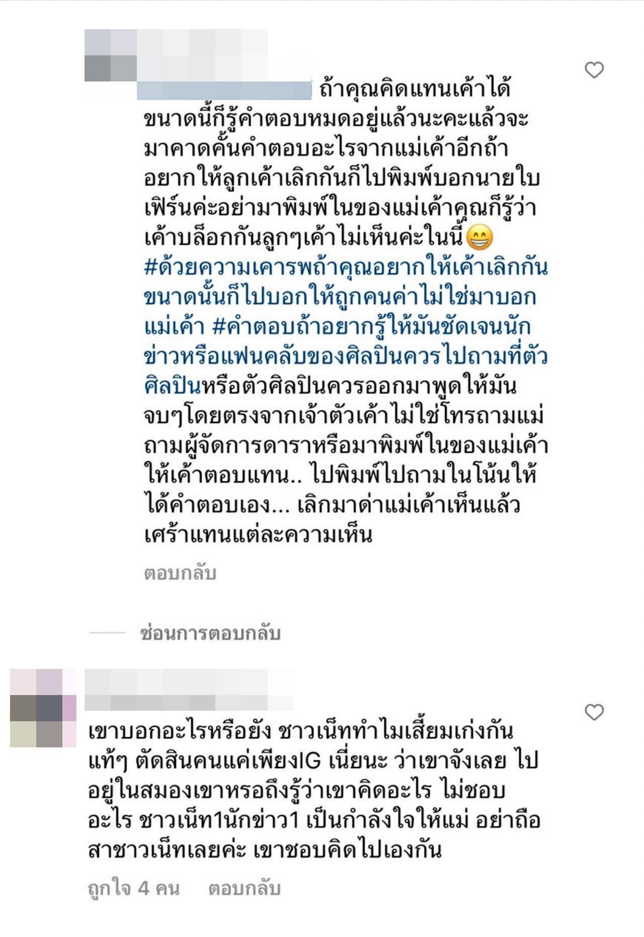 และล่าสุดดูเหมือนชาวเน็ตจะแบ่งเป็น 2 ฝ่าย และได้มีคนเข้าไปคอมเมนต์ในอินสตาแกรมของแม่หมู เขียนว่า "ไม่ไหวอย่าฝืน บอกให้ลูกปล่อยใบไปเถอะ ให้ใบได้ไปเจอคนอื่นเถอะ กับนายคงไม่ใช่เนื้อคู่กัน"