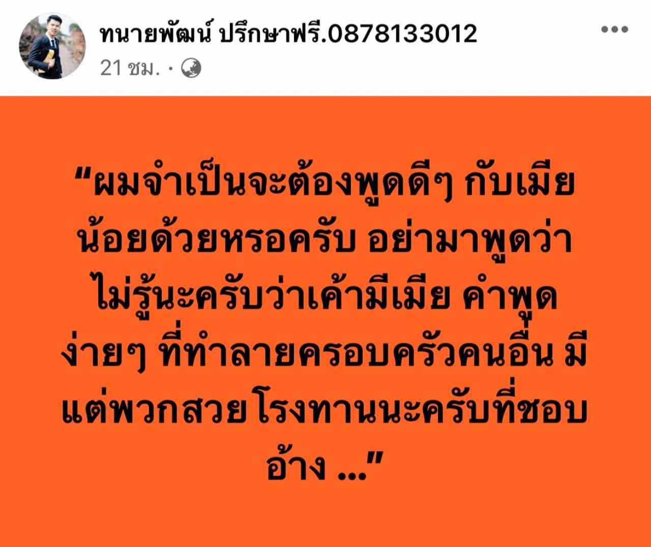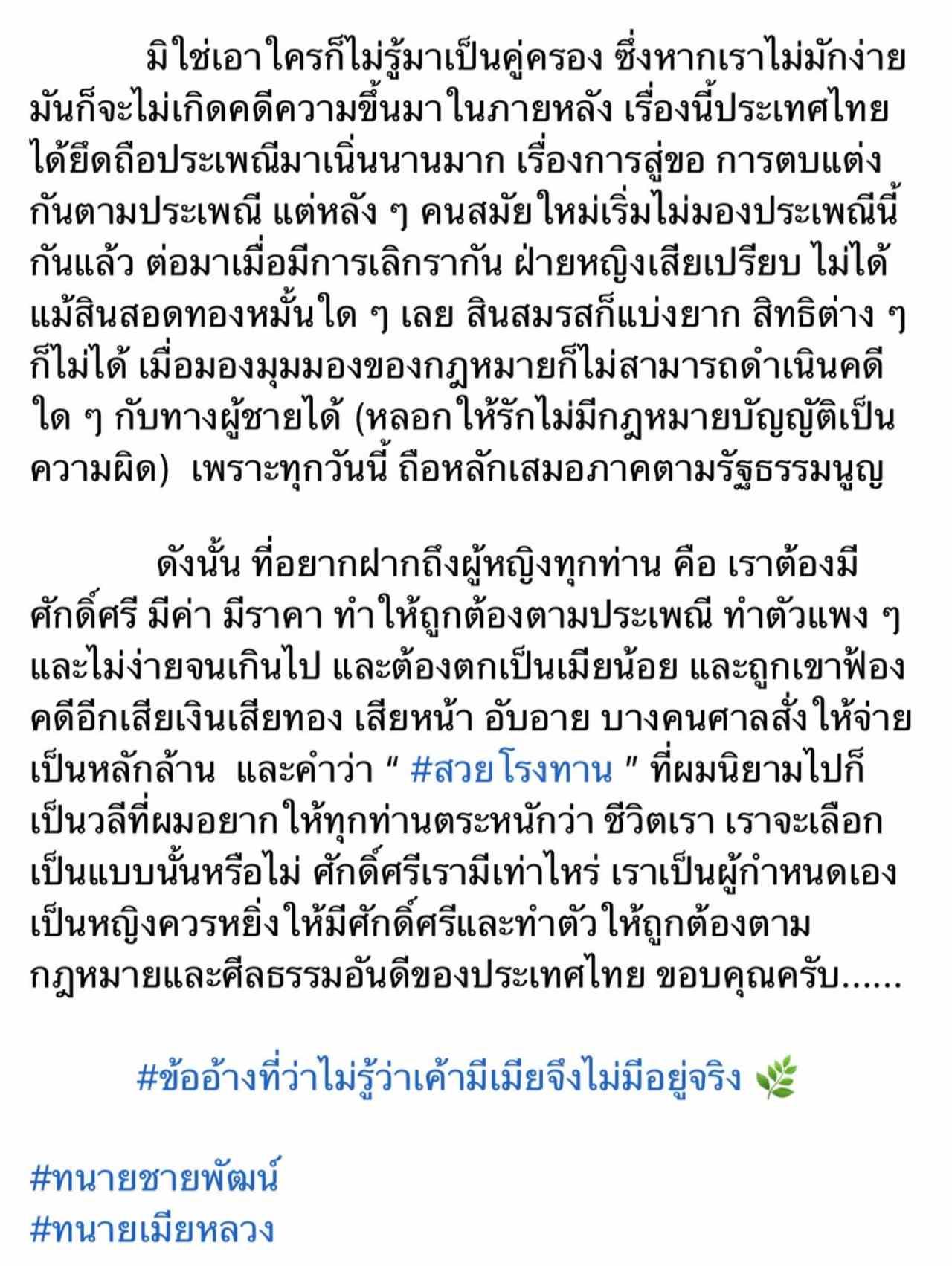 บางคนศาลสั่งให้จ่ายเป็นหลักล้าน และคำว่า “#สวยโรงทาน” ที่ผมนิยามไปก็เป็นวลีที่ผมอยากให้ทุกท่านตระหนักว่า ชีวิตเรา เราจะเลือกเป็นแบบนั้นหรือไม่ ศักดิ์ศรีเรามีเท่าไร เราเป็นผู้กำหนดเอง เป็นหญิงควรหยิ่งให้มีศักดิ์ศรี และทำตัวให้ถูกต้องตามกฎหมายและศีลธรรมอันดีของประเทศไทย ขอบคุณครับ...... #ข้ออ้างที่ว่าไม่รู้ว่าเขามีเมียจึงไม่มีอยู่จริง #ทนายชายพัฒน์ #ทนายเมียหลวง".