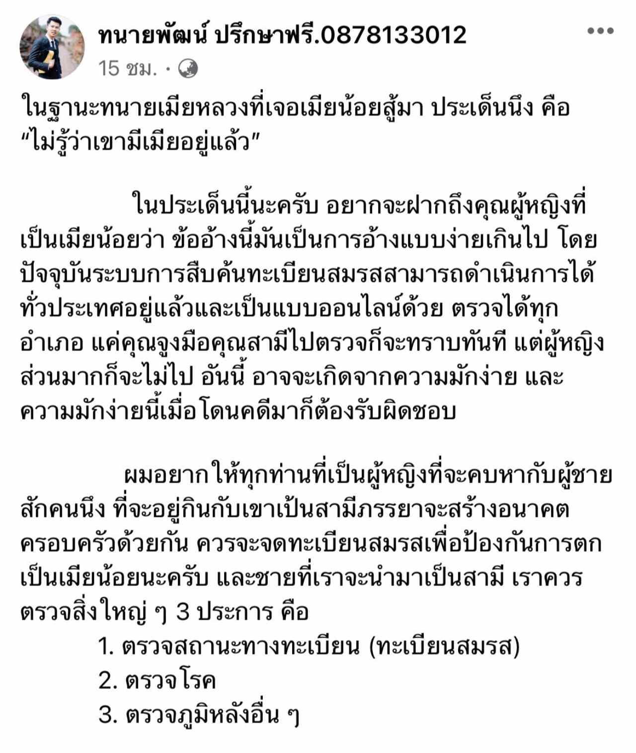 "ในฐานะทนายเมียหลวงที่เจอเมียน้อยสู้มา ประเด็นนึง คือ “ไม่รู้ว่าเขามีเมียอยู่แล้ว” ในประเด็นนี้นะครับ อยากจะฝากถึงคุณผู้หญิงที่เป็นเมียน้อยว่า ข้ออ้างนี้มันเป็นการอ้างแบบง่ายเกินไป