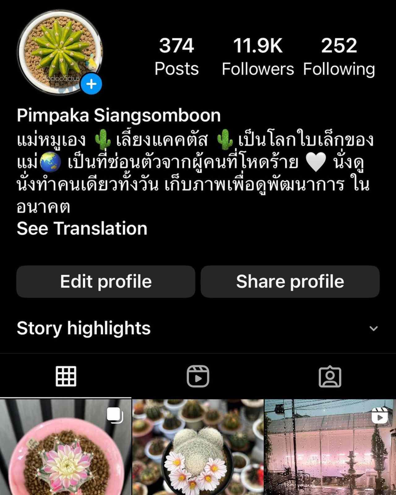 โดยแม่หมูได้เขียนที่หัวอินสตาแกรมของตัวเองเอาไว้ว่า "แม่หมูเอง เลี้ยงแคคตัส เป็นโลกใบเล็กของแม่ เป็นที่ซ่อนตัวจากผู้คนที่โหดร้าย นั่งดูนั่งทำคนเดียวทั้งวัน เก็บภาพเพื่อดูพัฒนาการในอนาคต"