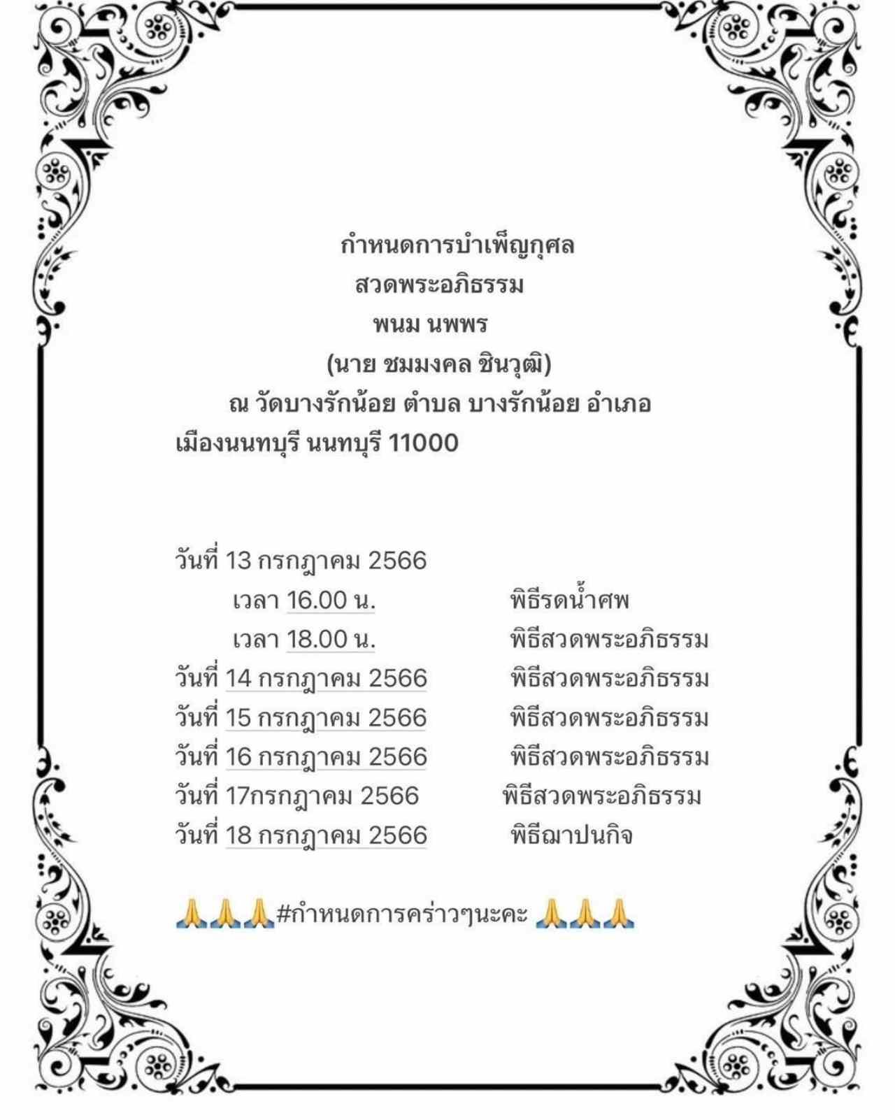 สำหรับกำหนดการบำเพ็ญกุศลสวดพระอภิธรรม พนม นพพร ที่วัดบางรักน้อย ต.บางรักน้อย อ.เมืองนนทบุรี วันที่ 13 เวลา 16.00 น. จะมีพิธีรดน้ำศพ และ 18.00 น. จะมีการสวดพระอภิธรรม และในวันที่ 18 ก.ค. จะมีพิธีฌาปนกิจ