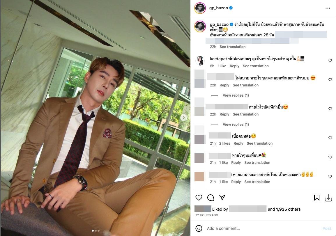 ทำเอาแฟนๆ ที่ได้เห็นภาพนอกจากจะมาอวยพรให้หายป่วยไวๆ แล้ว หลายคนยังเข้ามาแซวความหล่อหน้าเด็กของเจ้าตัว อาทิ เบื่อคนหล่อ, หล่อและเด็กมากกกก, หน้าเด็กมากกก, น่ารัก หายไวๆๆ ครับ, กรี๊ดดดด หล่อ, หายเร็วพลันดีทันใดครับโอปป้า/fc @gp_bazoo, เฮียหล่อเกิ๊นน ฯลฯ