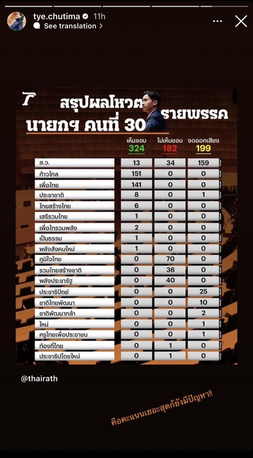 ก่อนจะโพสต์ภาพที่ด้านซ้ายเป็นภาพของนายชาดา ไทยเศรษฐ์ และด้านขวาเป็นภาพของ ทิม พิธา พร้อมทั้ง Quote คำพูดของทั้งคู่มาเปรียบเทียบกัน และเขียนข้อความ “ซ้ายเป็นไร” ก่อนจะโพสต์ภาพตารางสรุปผลโหวตนายกฯ คนที่ 30 แบบรายพรรคจากไอจี @thairath และเขียนข้อความว่า “คือคะแนนเยอะสุดก็ยังมีปัญหา!!”.