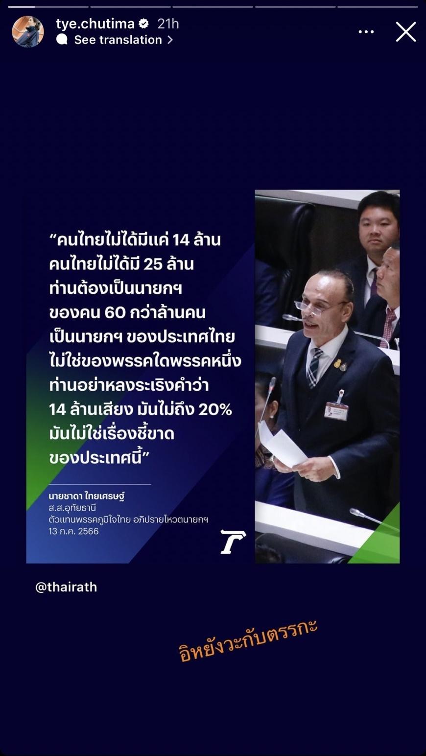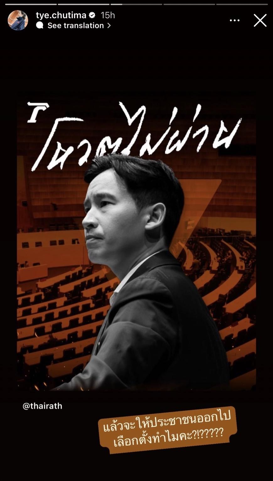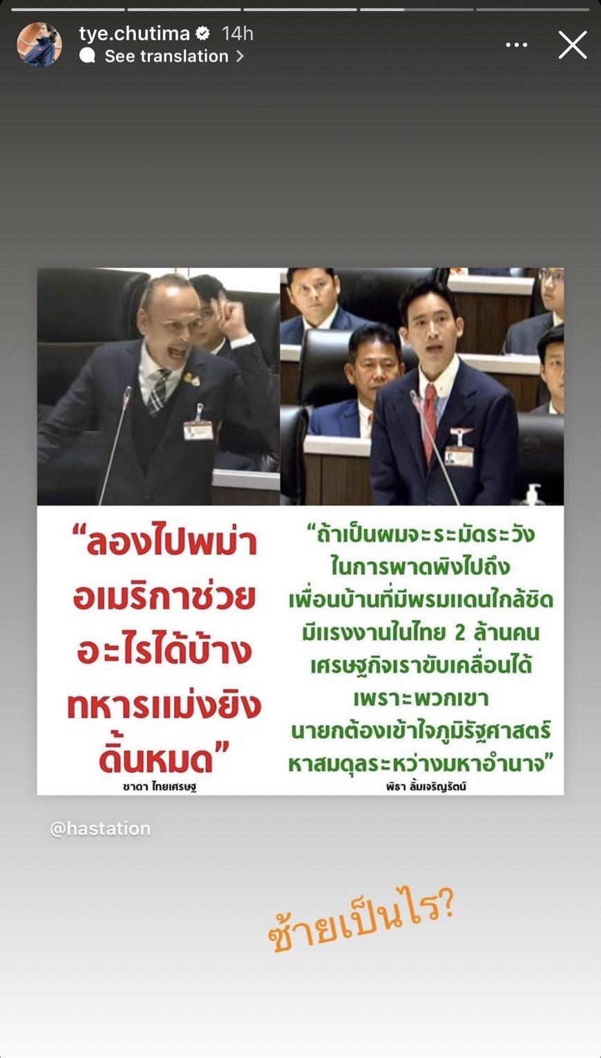 ล่าสุด นักแสดงสาว ต่าย ชุติมา ทีปะนาถ อดีตภรรยาของทิม พิธา ก็ได้แสดงความคิดเห็นอย่างเผ็ดร้อนผ่านทางไอจีสตอรี่แบบรัวๆ ทั้งโพสต์ภาพจากไอจี @thairath ที่ Quote คำพูดของ นายชาดา ไทยเศรษฐ์ ส.ส.อุทัยธานี ตัวแทนพรรคภูมิใจไทย อภิปรายโหวตนายกฯ พร้อมทั้งเขียนข้อความว่า “อิหยังวะกับตรรกะ” รวมถึงภาพ ทิม พิธา โหวตไม่ผ่าน จากไอจี @thairath พร้อมทั้งเขียนข้อความตั้งคำถามว่า “แล้วจะให้ประชาชนออกไปเลือกตั้งทำไมคะ?!?????”