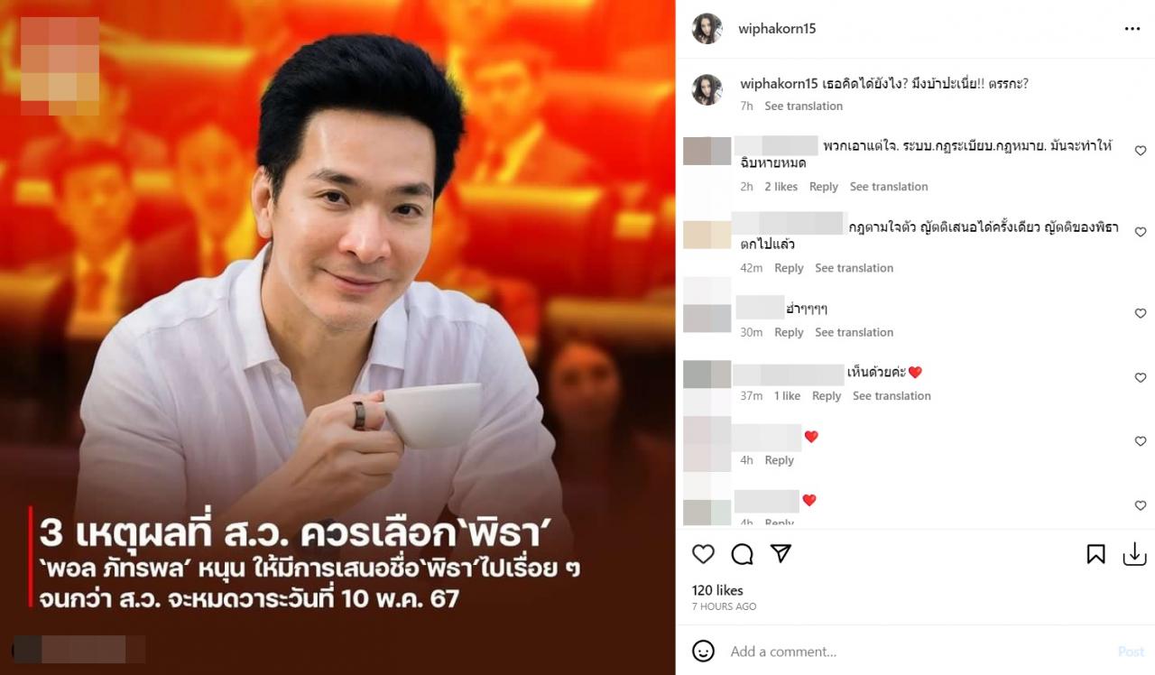 รวมถึงข้อความที่ว่า "การเมืองมันห่วยแตก กินส้มตำใส่ปลาแดก เวิร์กกว่า "เดินขบวนจนเกร่อ ฉันขอรักกับเธอดีกว่า" "2 ขั้วก็รักกันเหมือนเดิม!" อีกทั้งยังโพสต์ภาพ พอล ภัทรพล ที่มีข้อความพูดถึง 3 เหตุผลที่ ส.ว. ควรเลือก ทิม พิธา พร้อมทั้งเขียนข้อความว่า “เธอคิดได้ยังไง? มึงบ้าปะเนี่ย!! ตรรกะ?".