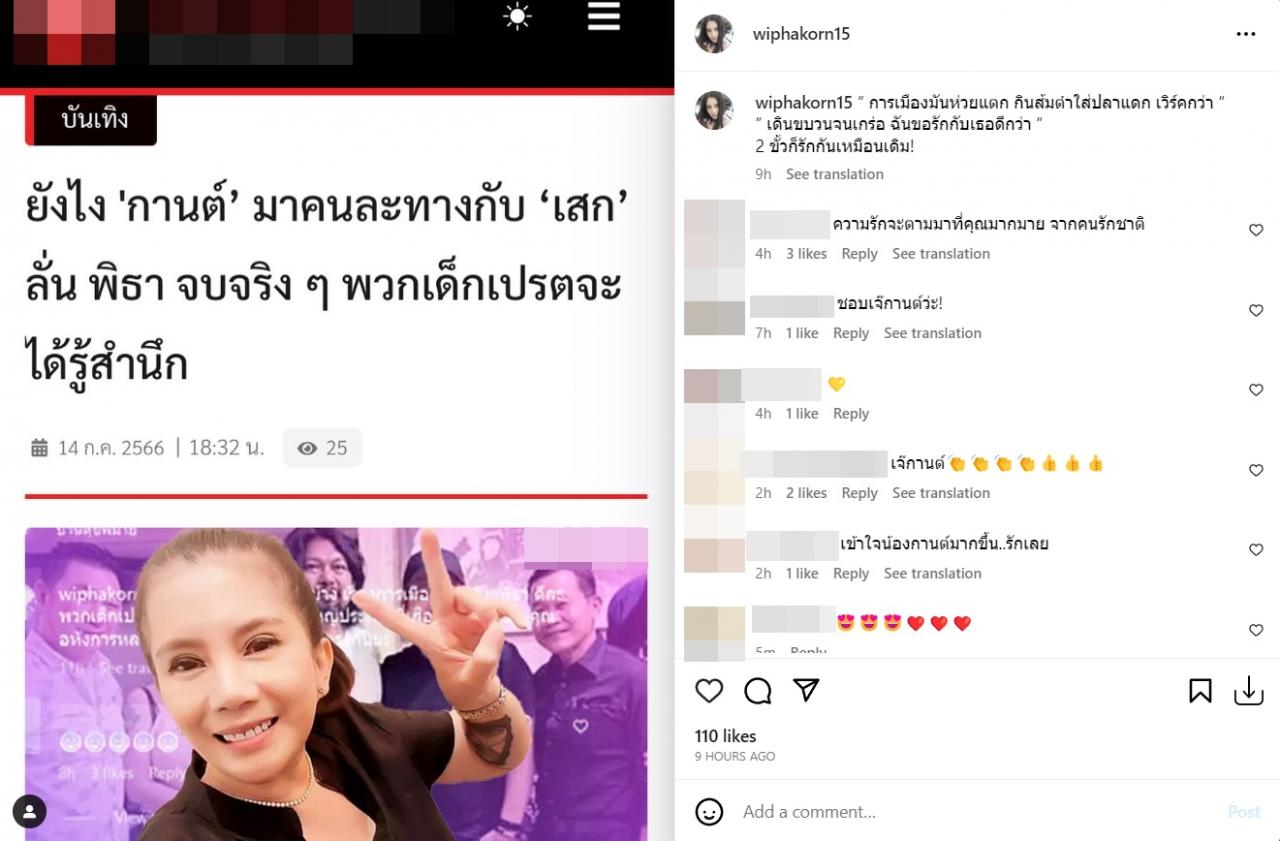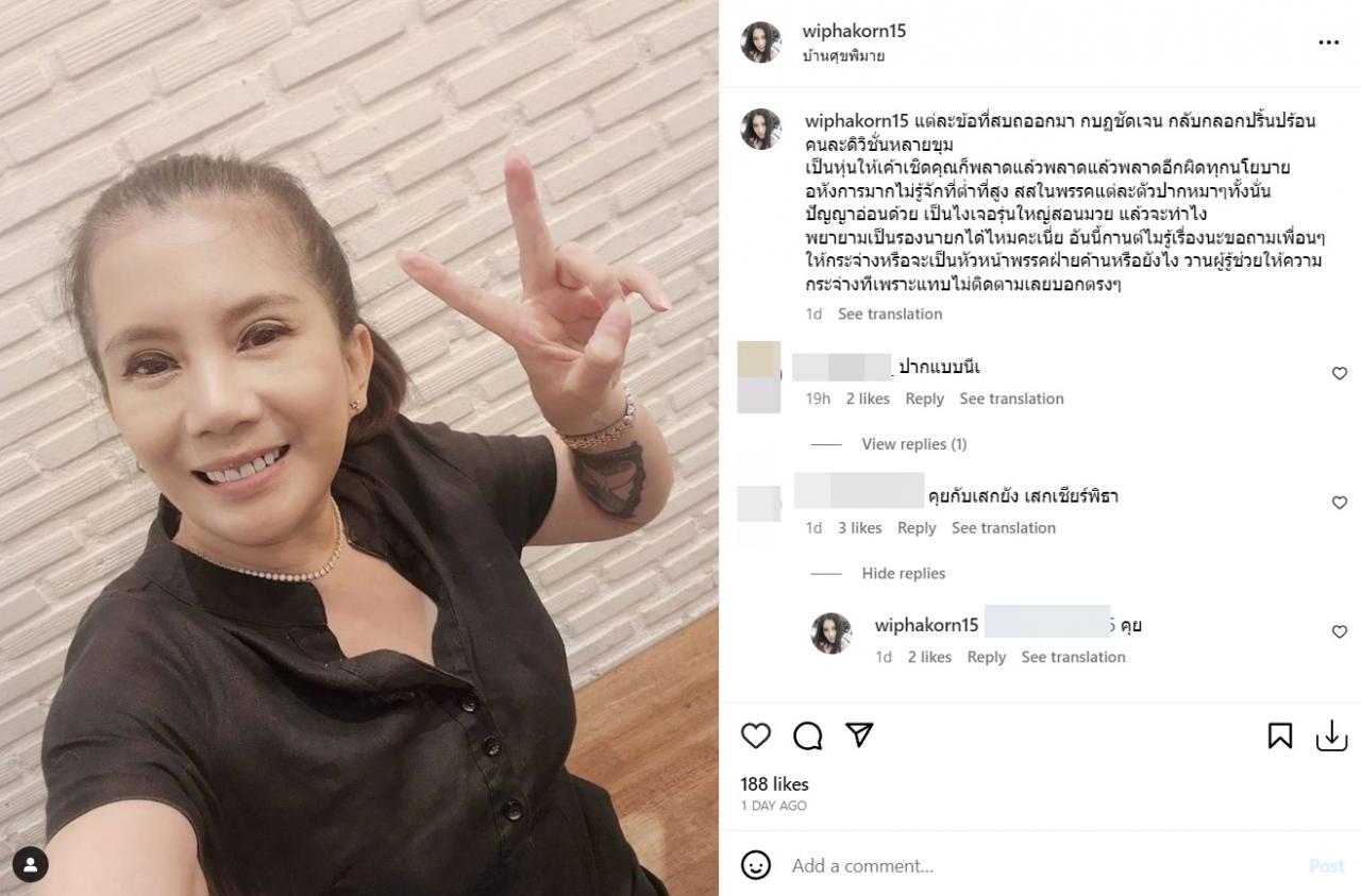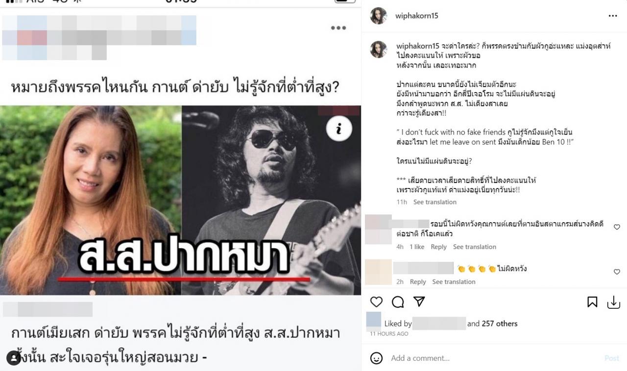 ก่อนจะโพสต์ภาพข่าวตัวเองที่ด่าพรรคการเมือง พร้อมทั้งเขียนข้อความว่า “จะด่าใครล่ะ? ก็พรรคตรงข้ามกับผัวกูอะแหละ แม่งอุตส่าห์ไปลงคะแนนให้ เพราะผัวขอ หลังจากนั้น เลอะเทอะมาก ปากแต่ละคน ขนาดนี้ยังไม่เจียมตัวอีกนะ ยังมีหน้ามาบอกว่า อีกสี่ปีเจอโรม จะไม่มีแผ่นดินจะอยู่ มึงกล้าพูดนะพวก ส.ส.ไม่เดียงสาเลย กว่าจะรู้เดียงสา!!