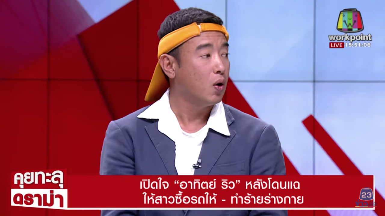 ริว : นุชฟังสิ่งที่พี่ริวจะพูดนะ พี่ริวกล้ายอมรับ เพราะว่าต้องการให้รู้สถานการณ์จริง ผมกล้ายอมรับต่อคุณผู้ชมและปอเปี๊ยะ ว่ามีการฉุดกระชากเกิดขึ้น และผมก็ยอมรับว่าผมได้ดื่มแอลกอฮอล์ เพราะว่าวันนั้น เราเพิ่งเดินทางกลับมาจากพิษณุโลกเพื่อจะมาคุยเรื่องโอนรถ ให้น้องแนน และนำเอกสารชื่อน้องแนน ทะเบียนบ้าน ตัวสัญญาแล้วก็เซ็นโอนลอยใบมอบฉันทะเพื่อให้เต็นท์รถดำเนินการในวันนั้นเลย (วันนั้นเมา) ไม่ใช่ๆ ก่อนหน้านั้น เราคุยกันเรื่องรถว่าจะจัดการให้เป็นชื่อน้องแนนให้เรียบร้อย ซึ่งอันนี้เกิดหลายวันที่แล้ว และผมก็พยายามจัดการให้มันชัดเจนเพราะผมก็กลัวข้อครหาเหมือนกันในเรื่องของการเป็นคนซื้อรถ และน้องแนนเป็นคนเลือก ผมไม่ได้ต้องการของของน้องแนน