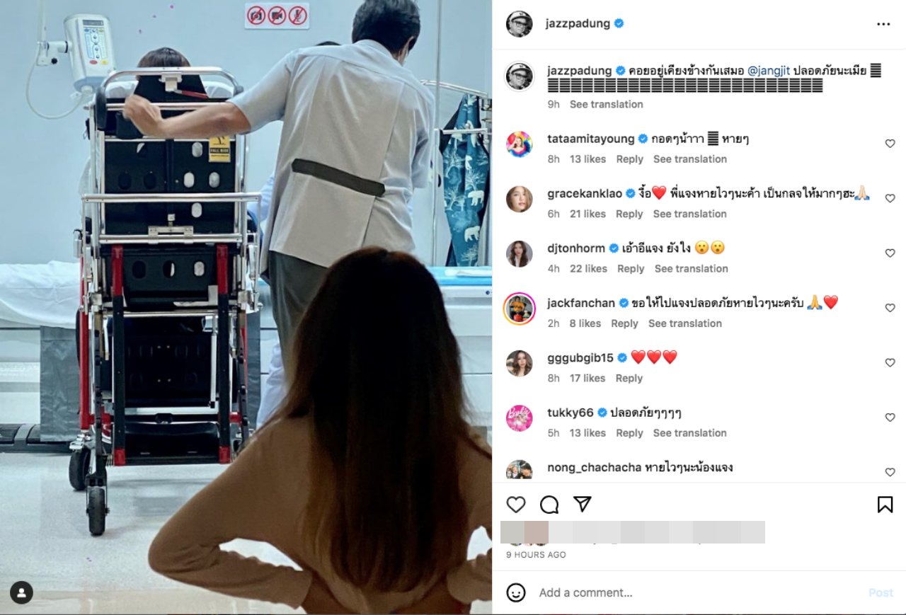 ซึ่ง แจ๊ส ได้โพสต์รูปดังกล่าว พร้อมกับเขียนแคปชั่นสั้นๆ แต่อ่านแล้วซึ้งใจสุดๆ ว่า "คอยอยู่เคียงข้างกันเสมอ @jangjit ปลอดภัยนะเมีย" งานนี้ทำเอาเพื่อนๆ ในวงการบันเทิง และแฟนๆ ถึงกับเป็นห่วงไม่น้อย ต่างพร้อมใจกันคอมเมนต์ส่งกำลังใจให้ แจง นั้นปลอดภัย และหายไวๆ อย่างล้นหลาม.