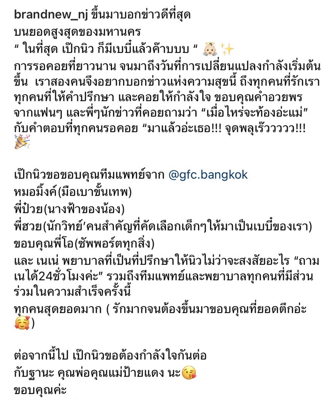 "ขึ้นมาบอกข่าวดีที่สุด บนยอดสูงสุดของมหานคร "ในที่สุด เป๊กนิว ก็มีเบบี๋แล้วค้าบบบ" การรอคอยที่ยาวนาน จนมาถึงวันที่การเปลี่ยนแปลงกำลังเริ่มต้นขึ้น เราสองคนจึงอยากบอกข่าวแห่งความสุขนี้ ถึงทุกคนที่รักเรา ทุกคนที่ให้คำปรึกษา และคอยให้กำลังใจ ขอบคุณคำอวยพรจากแฟนๆ และพี่ๆ นักข่าวที่คอยถามว่า “เมื่อไหร่จะท้องอะแม่” กับคำตอบที่ทุกคนรอคอย "มาแล้วอะเธอ!!!" จุดพลุเร้ววววว!!! ต่อจากนี้ไป เป๊กนิวต้องขอกำลังใจกันต่อกับฐานะ คุณพ่อคุณแม่ป้ายแดง นะ ขอบคุณค่ะ"