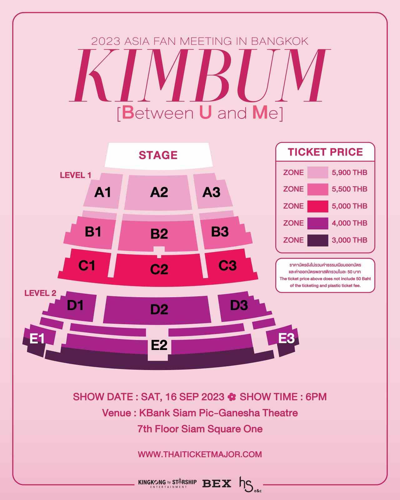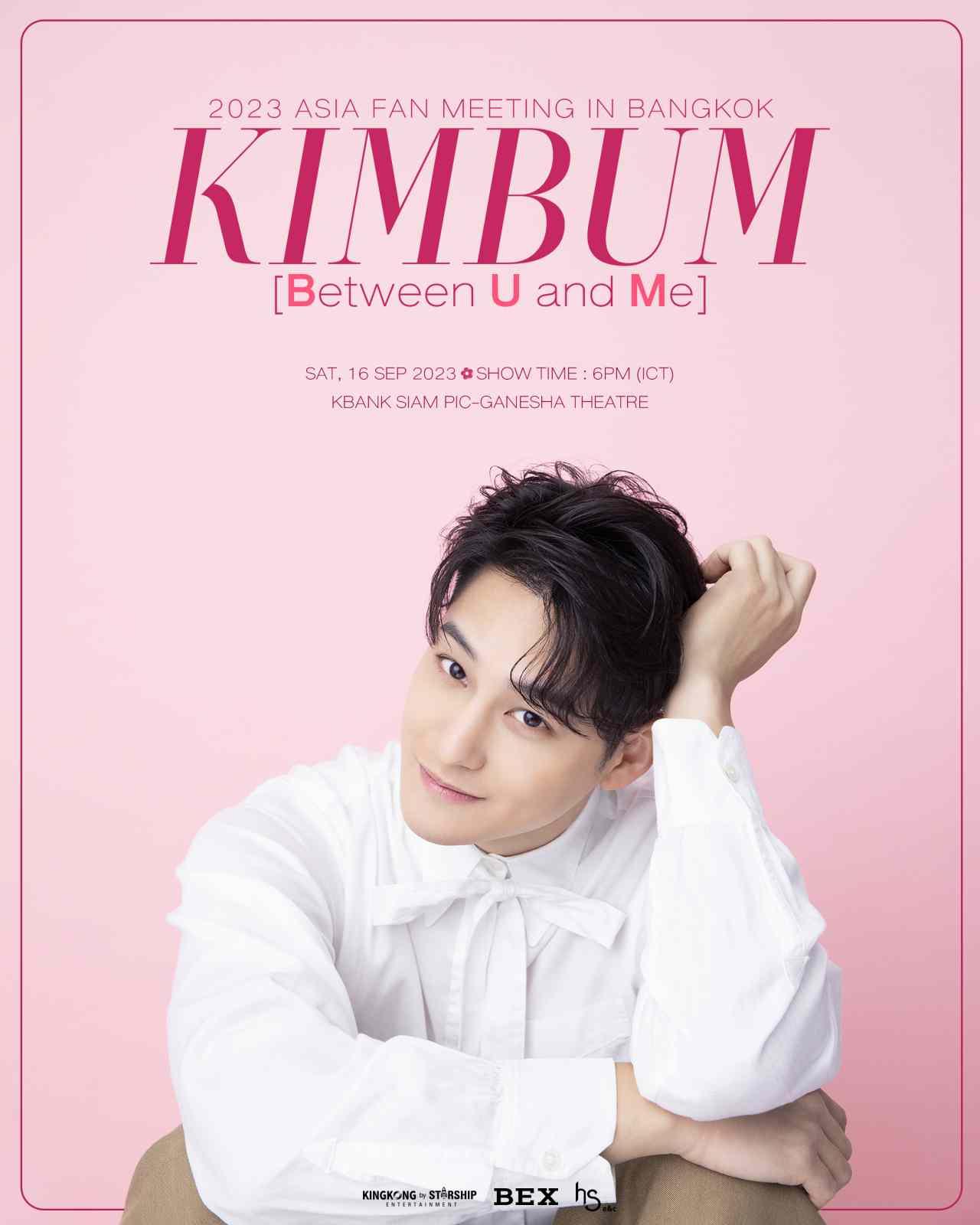 งาน “2023 KIM BUM ASIA FAN MEETING IN BANGKOK [Between U and ME]” สุดพิเศษนี้ สร้างสรรค์โดย BEX (เบ็ก) ร่วมกับ KINGKONG by STARSHIP (คิงคอง บาย สตาร์ชิป) และ HS E&C (เฮชเอส อี แอนด์ ซี) และงานจะจัดขึ้นในวันเสาร์ที่ 16 กันยายน 2566 เวลา 18:00 น. ณ โรงละครเคแบงก์สยามพิฆเนศ บัตรราคา 5,900 / 5,500 / 5,000 / 4,000 และ 3,000 บาท เปิดจำหน่ายบัตรทาง www.thaiticketmajor.com และ ไทยทิคเก็ตเมเจอร์ เคาน์เตอร์ ในวันที่ 12 สิงหาคม 2566 ตั้งแต่เวลา 10:00 น. เป็นต้นไป
