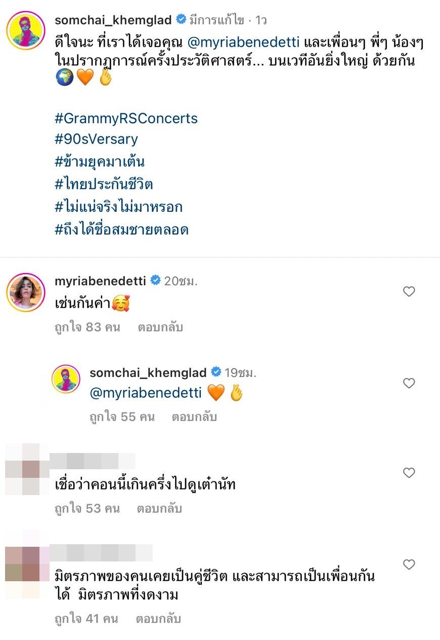ซึ่ง เต๋า สมชาย เขียนแคปชั่นบรรยายไว้ว่า “ดีใจนะ ที่เราได้เจอคุณ @myriabenedetti และเพื่อนๆ พี่ๆ น้องๆ ในปรากฏการณ์ครั้งประวัติศาสตร์... บนเวทีอันยิ่งใหญ่ ด้วยกัน” ด้าน นัท มีเรีย ก็ได้คอมเมนต์ตอบกลับว่า “เช่นกันค่า”