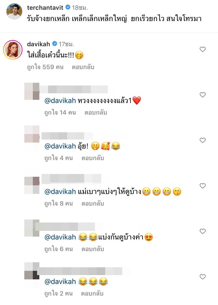ท่ามกลางคอมเมนต์จากคนในวงการบันเทิงและแฟนๆ ที่เข้ามาแซวความแซ่บและส่งอีโมจิไฟลุกกับปรบมือเต็มไอจี ส่วน ใหม่ ดาวิกา ถึงกับคอมเมนต์ว่า “ใส่เสื้อเด๋วนี้นะ!!!” ทำเอาแฟนๆ แห่คอมเมนต์แซว อาทิ หวงงงงงงงงงแล้ว 1, อุ้ย!, แม่เบาๆ แบ่งๆ ให้ดูบ้าง, เค้าหวงกันด้วยอะเธ๊อออ!!!!, ให้ลุงโชว์กล้ามเน้นๆ หน่อยนะคะดาวิ ฯลฯ