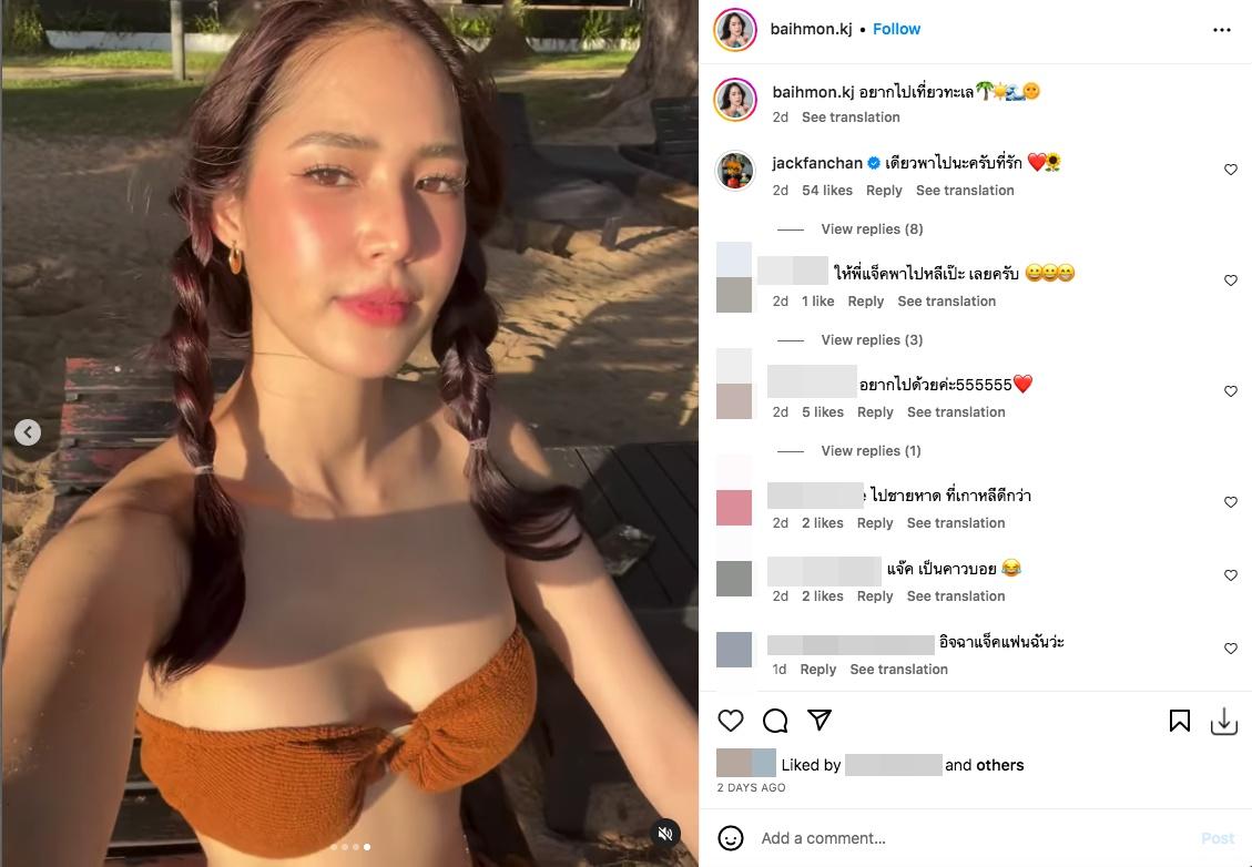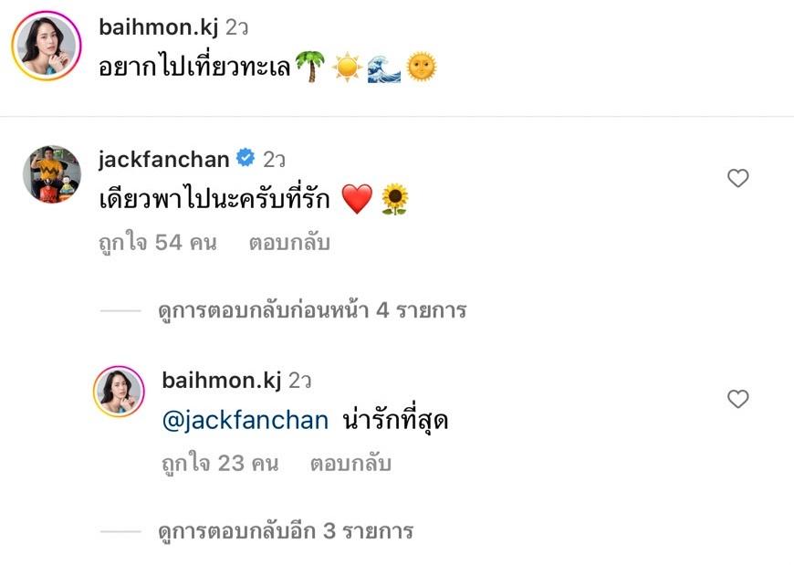 อีกทั้งใบหม่อนก็ได้โพสต์ภาพและคลิปนุ่งชุดบิกินีสีน้ำตาลเดินเที่ยวเล่นในชายหาด พร้อมทั้งเขียนข้อความว่า “อยากไปเที่ยวทะเล” และแจ็คก็คอมเมนต์ว่า “เดี๋ยวพาไปนะครับที่รัก” งานนี้ใบหม่อนก็ตอบกลับว่า “น่ารักที่สุด” ด้วย.