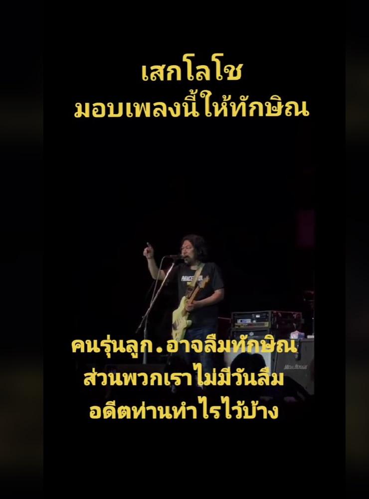 โดยก่อนที่จะร้องเพลงดังกล่าว เสกได้พูดบนเวทีคอนเสิร์ตว่า "ผมเชื่อเหลือเกินว่าไอ้สิ่งที่ผมพูดต่อไปนี้จะเป็นข่าวหน้าหนึ่งในวันต่อไป ผมจะร้องเพลงกับคุณทักษิณ ชินวัตร นะครับเพื่อนๆ ครับ เขาจะกลับมาในวันที่ 10 ส.ค.นี้ เด็กๆ ไม่ค่อยชอบให้กูพูดอย่างนี้เท่าไรนักหรอก แต่ขอพูดหน่อยหนึ่ง เพราะหัวใจประชาธิปไตย เพราะงั้นคนที่เป็นประชาธิปไตย จะพูดอะไรก็ได้ ถูกต้องใช่ไหมครับ" (ชมคลิป)