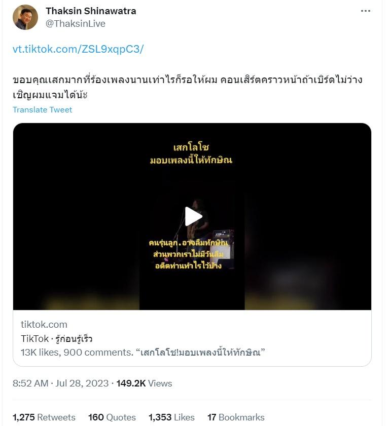 ซึ่งหลังจากที่มีชาวโซเชียลได้แชร์คลิปดังกล่าวลงใน TikTok ก็มีคนแสดงความคิดเห็นเป็นจำนวนมาก ด้าน ทักษิณ ชินวัตร ก็ได้แชร์คลิปดังกล่าวลงในทวิตเตอร์ส่วนตัว @ThaksinLive พร้อมทั้งเขียนข้อความถึงเสกว่า "ขอบคุณเสกมากที่ร้องเพลงนานเท่าไรก็รอให้ผม คอนเสิร์ตคราวหน้าถ้าเบิร์ดไม่ว่างเชิญผมแจมได้น้ะ".