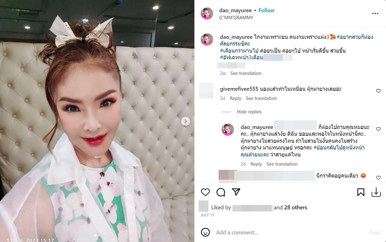 กลายเป็นประเด็นที่ทำเอานักร้องลูกทุ่งสาว ดาว มยุรี ทนไม่ไหว ต้องโต้กลับไปแบบจุกๆ เมื่อเจ้าตัวโพสต์ภาพตัวเองหลังไปศัลยกรรมและแต่งหน้าจนสวยฉ่ำ พร้อมทั้งเขียนแคปชั่นว่า “ไก่งามเพราะขน คนงามเพราะแต่ง #อยากสวยก็ต้องศัลยกรรมซิคะ เดือนกว่าผ่านไปค่อยเป็นค่อยไป หน้าเริ่มดีสวยขึ้น”