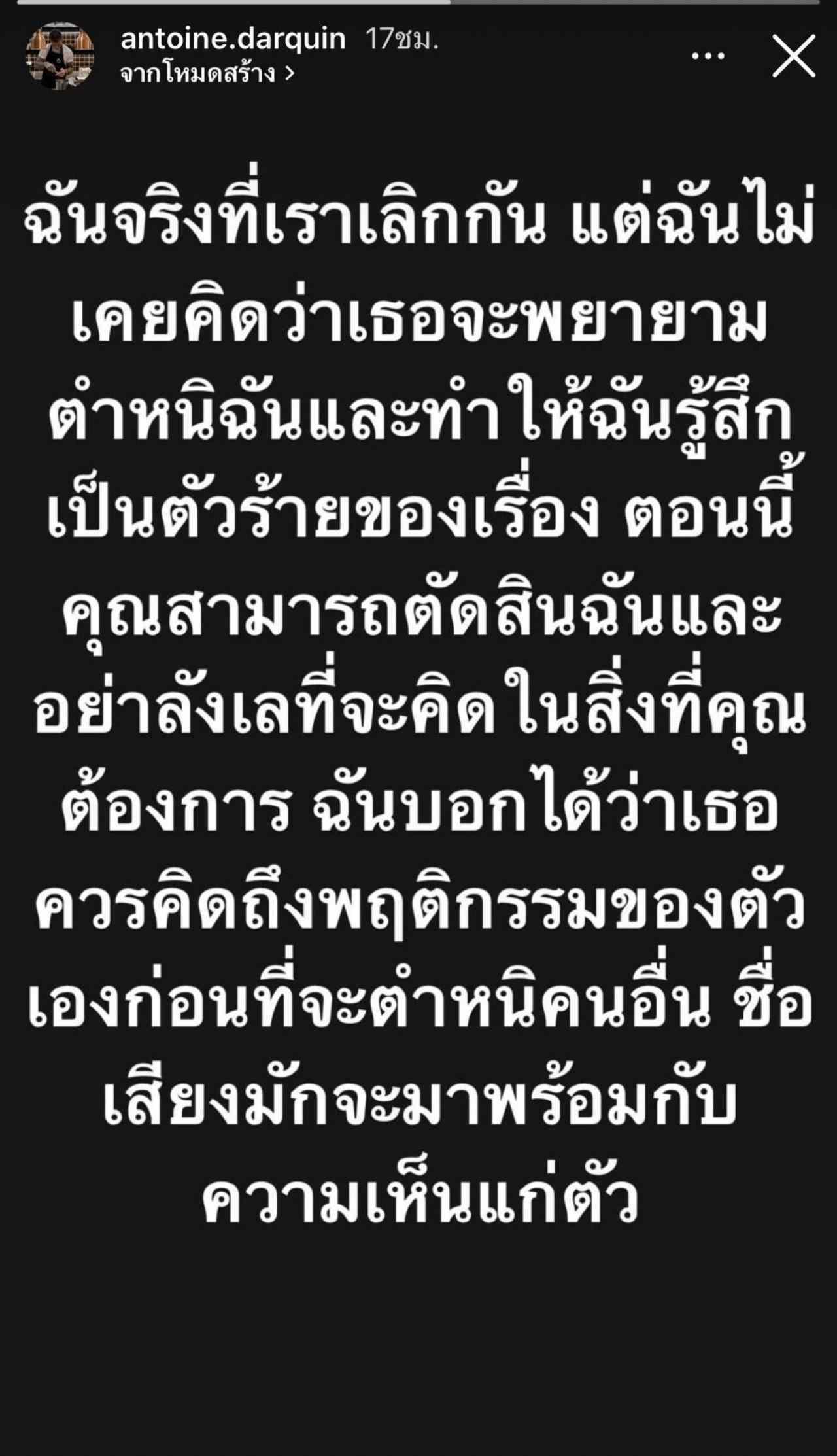 หลังจากที่ มิ้วกี้ โพสต์แจ้งสถานะของตัวเองไป ล่าสุด เชฟหนุ่มชื่อดัง ก็ได้ออกมาเคลื่อนไหวผ่านทางไอจีสตอรี่เป็นข้อความคาดว่าน่าจะแปลจากภาษาอังกฤษอีกที ที่เขียนว่า “ฉันจริงที่เราเลิกกัน แต่ฉันไม่เคยคิดว่าเธอจะพยายามตำหนิฉันและทำให้ฉันรู้สึกเหมือนตัวร้ายของเรื่องนี้