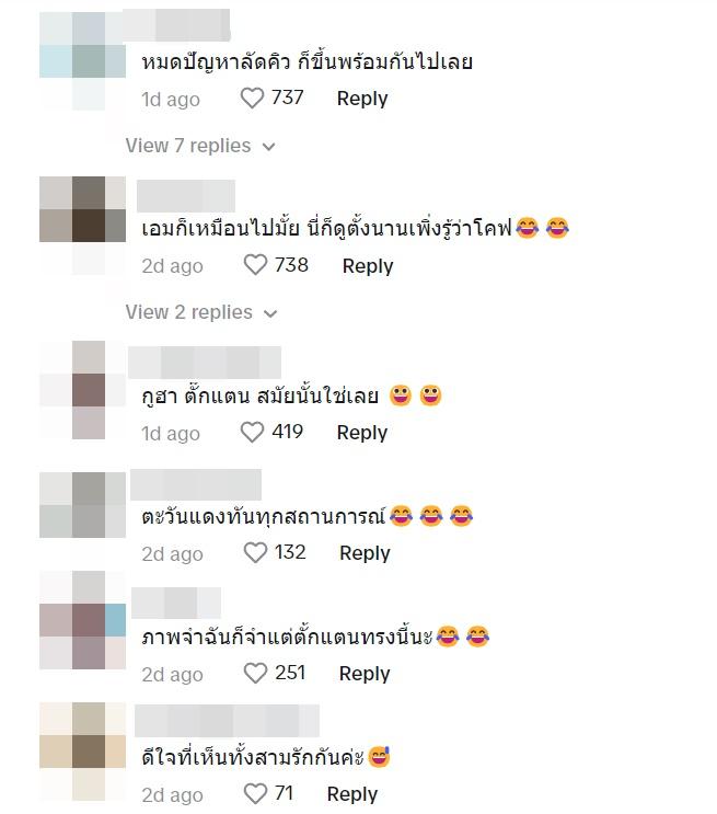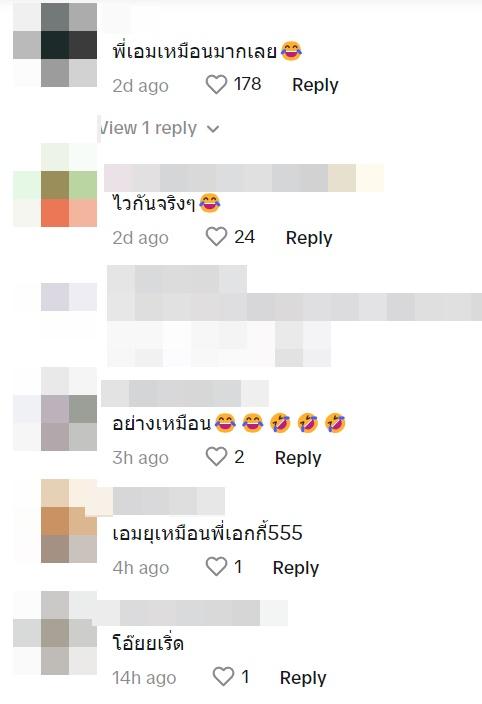 ล่าสุด มีผู้ใช้ TikTok แชร์คลิปพร้อมทั้งเขียนแคปชั่นในคลิปว่า “จ๊ะ เอม ตั๊กแตน ขึ้นเวทีเดียวกัน” ทำเอาชาวเน็ตทั้งหลายแห่ส่องกันรัวๆ แต่พอซูมดูแบบชัดๆ บอกเลยพีกมาก เพราะแต่ละคนโคฟซะเหมือนจริงๆ งานนี้ชาวเน็ตเลยคอมเมนต์แซว อาทิ หมดปัญหาลัดคิว ก็ขึ้นพร้อมกันไปเลย, เอมก็เหมือนไปมั้ย นี่ก็ดูตั้งนานเพิ่งรู้ว่าโคฟ, กูฮา ตั๊กแตน สมัยนั้นใช่เลย, ภาพจำฉันก็จำแต่ตั้กแตนทรงนี้นะ, พี่เอมเหมือนมากเลย, ไวกันจริงๆ, อย่างเหมือน ฯลฯ