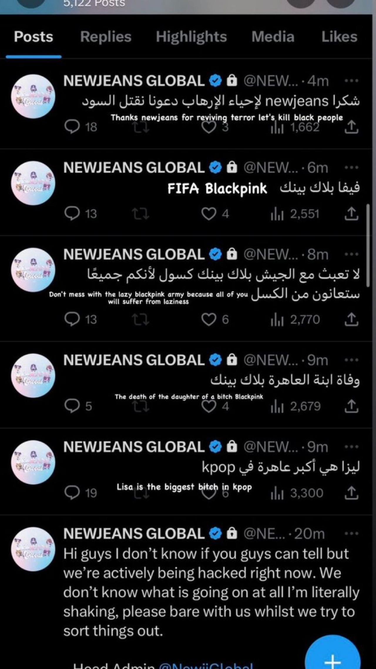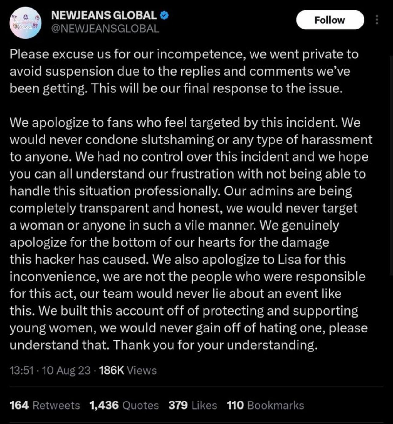 หลังจากที่เกิดเหตุการณ์ดังกล่าวไม่นาน แอดมินของแอคเคานต์ NewJeans Global ก็ได้ออกมาชี้แจงว่า แอคเคานต์นี้ถูกแฮกเกอร์โจมตี และเหล่าแอดมินทุกคนไม่ได้เป็นคนโพสต์ข้อความที่ต่อว่า ลิซ่า BLACKPINK รวมถึงในช่วงเวลาหนึ่งก็มีข้อความภาษาอารบิกแปลกๆ โพสต์ในแอคเคานต์ของ NewJeans Global อีกด้วย