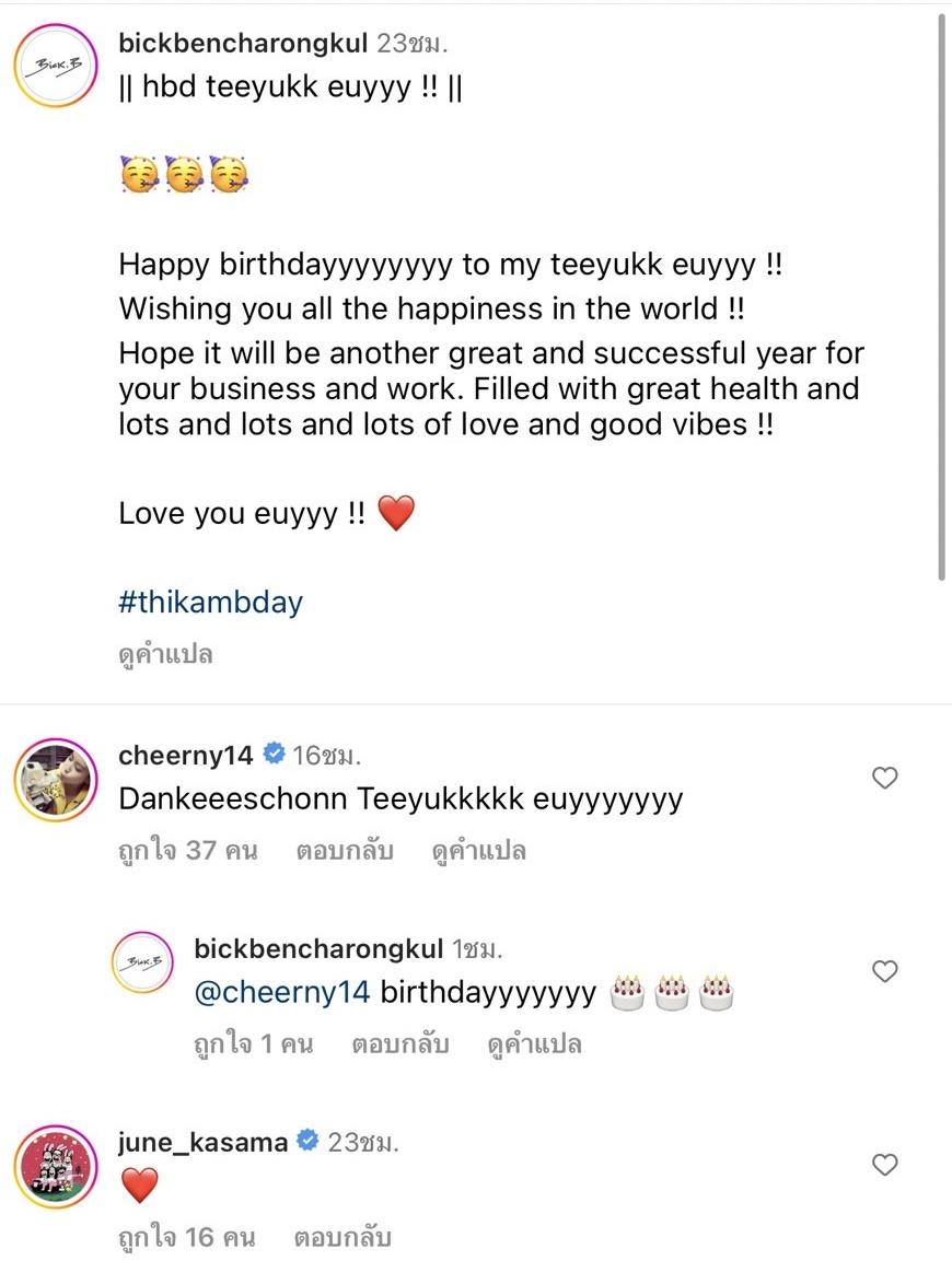 โดยมีทั้งคนในวงการบันเทิงและแฟนๆ คอมเมนต์อวยพรวันเกิดให้ สาวเชียร์ เป็นจำนวนมาก ด้าน เชียร์ ก็เข้ามาคอมเมนต์ตอบกลับแบบน่ารักๆ ว่า “Dankeeeschonn Teeyukkkkk euyyyyyyy”.