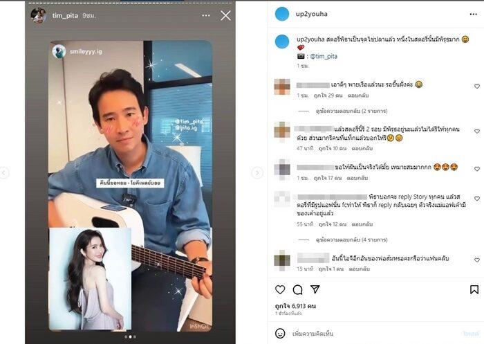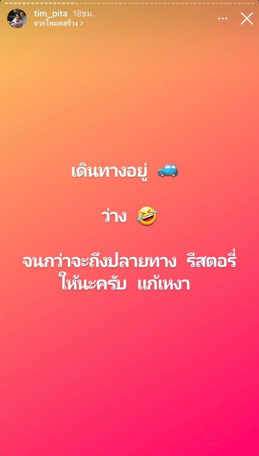 และล่าสุด ทิม พิธา โพสต์ข้อความลงในไอจีสตอรี่ไว้ว่า “เดินทางอยู่ ว่าง จนกว่าจะถึงปลายทาง รีสตอรี่ให้นะครับ แก้เหงา” หลังจากนั้นเจ้าตัวก็รีโพสต์ไอจีสตอรี่จากชาวเน็ตแบบรัวๆ ซึ่งส่วนใหญ่จะเป็นการให้กำลังใจ บ้างก็เขียนข้อความขอให้เจ้าตัวรีโพสต์สตอรี่ด้วย