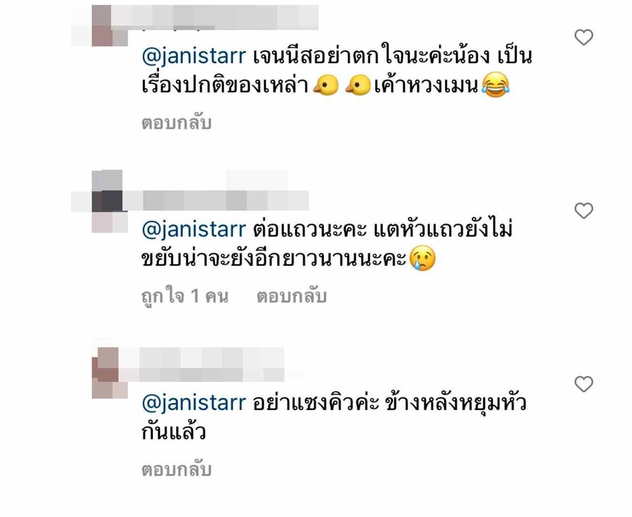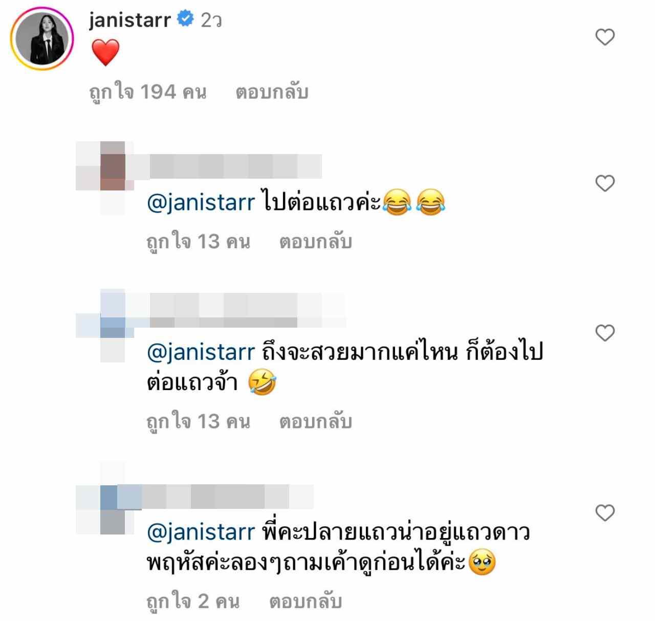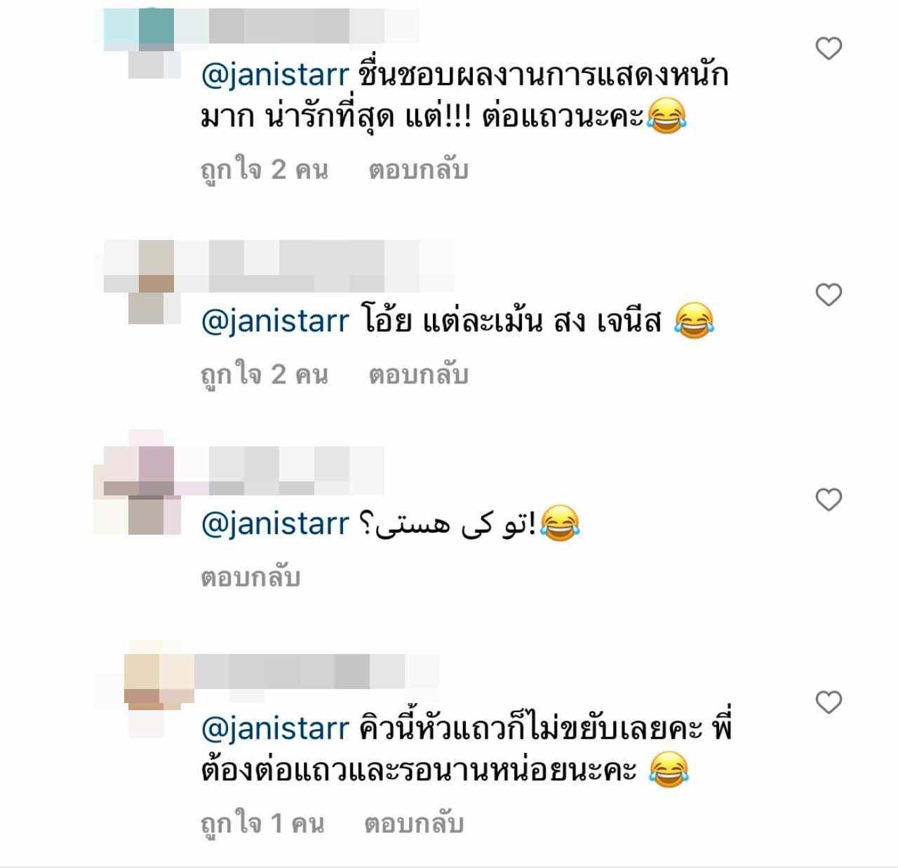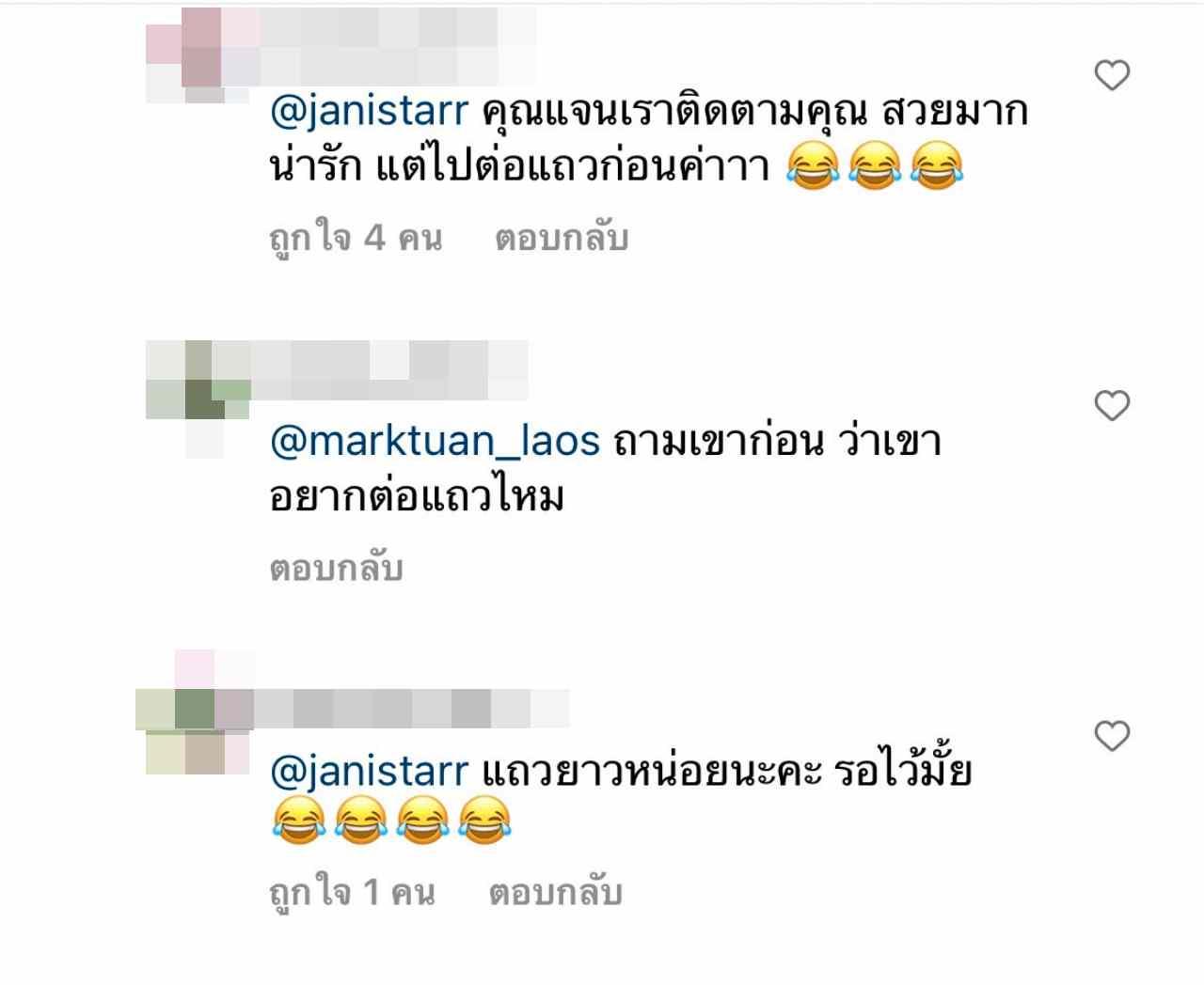 และหลังจากที่ เจนิส คอมเมนต์ไป ก็มีเหล่าอากาเซ่ไทย เข้าไปคอมเมนต์แซวขำๆ ในคอมเมนต์ของ เจนิส ว่า “ไปต่อแถวค่ะ, ถึงจะสวยมากแค่ไหน ก็ต้องไปต่อแถวจ้า, พี่คะ ปลายแถวน่าจะอยู่แถวดาวพฤหัสค่ะ ลองๆ ถามเค้าดูก่อนได้ค่ะ, คุณเจ เราติดตามคุณ สวยมาก น่ารัก แต่ไปต่อแถวก่อนค่าาา, ชื่นชอบผลงานการแสดงหนักมาก น่ารักที่สุด แต่!!! ต่อแถวนะคะ, โอ๊ย แต่ละเมนต์ สงสารเจนิส, เจนิสอย่าตกใจนะคะน้อง เป็นเรื่องปกติของเหล่านก เค้าหวงเมน, อย่าแซงคิวค่ะ ข้างหลังหยุมหัวกันแล้ว”