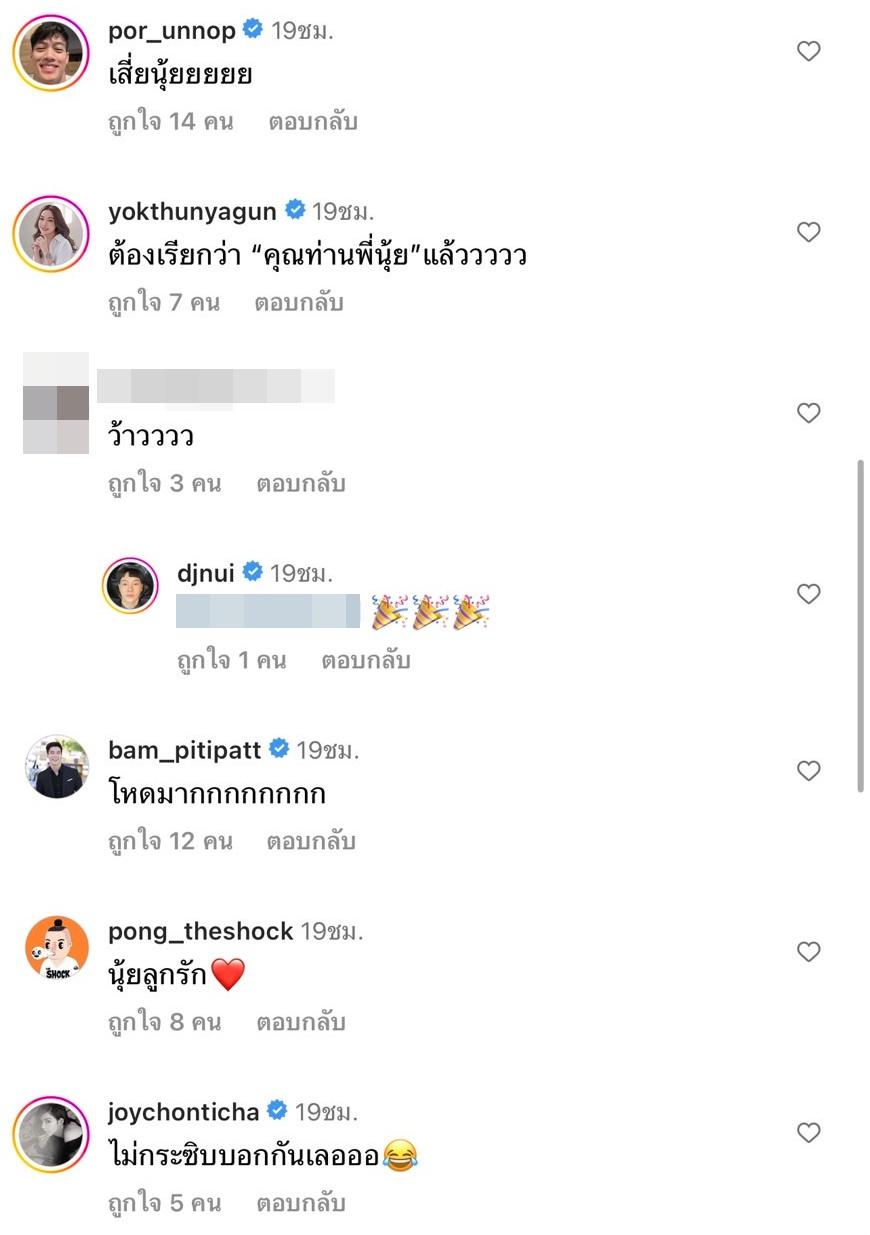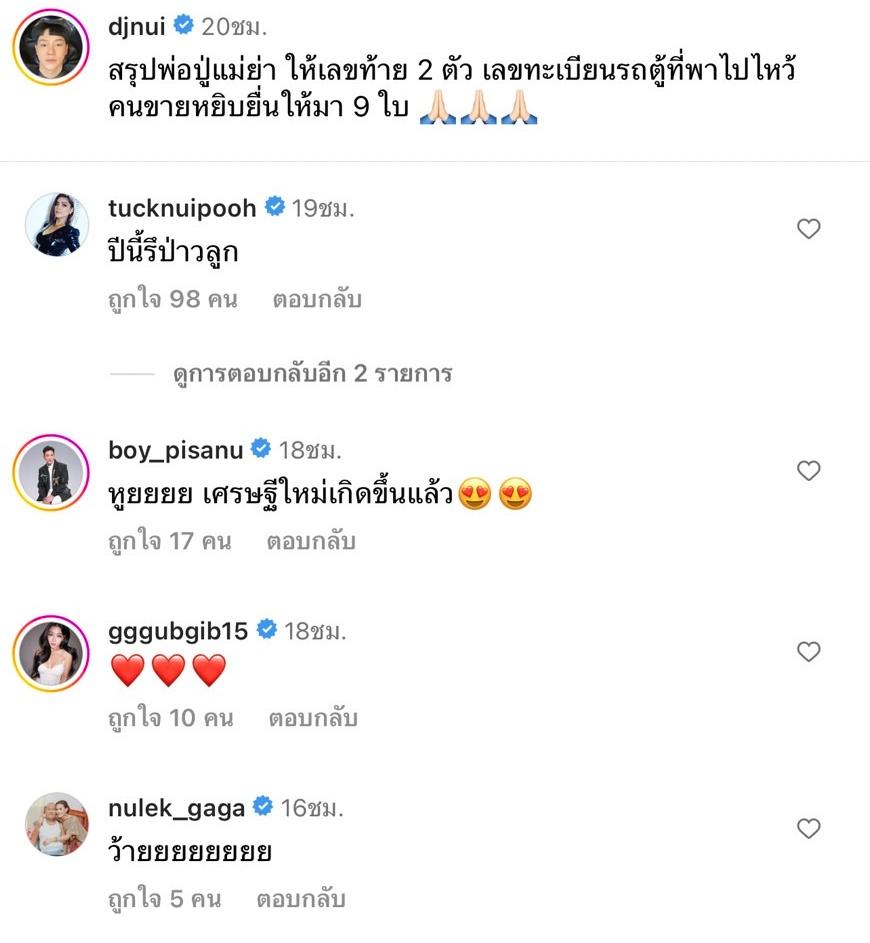 ท่ามกลางคอมเมนต์จากคนในวงการบันเทิงที่เข้ามาแซว อาทิ ตั๊ก ศิริพร “ปีนี้รึป่าวลูก”, บอย พิษณุ “หูยยยย เศรษฐีใหม่เกิดขึ้นแล้ว”, หนูเล็ก ก่อนบ่าย “ว้ายยยยยยยย”, หยก ธัญยกันต์ “ต้องเรียกว่า “คุณท่านพี่นุ้ย” แล้ววววว”, ปอ อรรณพ “เสี่ยนุ้ยยยยย”, จอย ชลธิชา “ไม่กระซิบบอกกันเลอออ”, แบม ปีติภัทร “โหดมากกกกกกกก” ฯลฯ