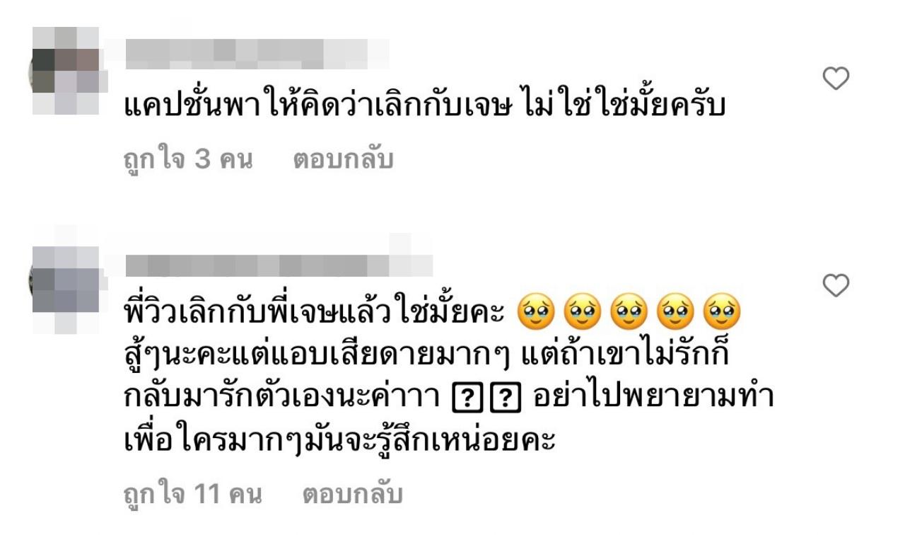 หลังจากโดยชาวเน็ตโผล่คอมเมนต์ถามวิวตรงๆ ว่า "พี่วิวเลิกกับพี่เจษแล้วใช่มั้ยคะ สู้ๆ นะคะแต่แอบเสียดายมากๆ แต่ถ้าเขาไม่รักก็กลับมารักตัวเองนะค่าาา อย่าไปพยายามทำเพื่อใครมากๆ มันจะรู้สึกเหนื่อยค่ะ, แคปชั่นพาให้คิดว่าเลิกกับเจษ ไม่ใช่ใช่มั้ยครับ,