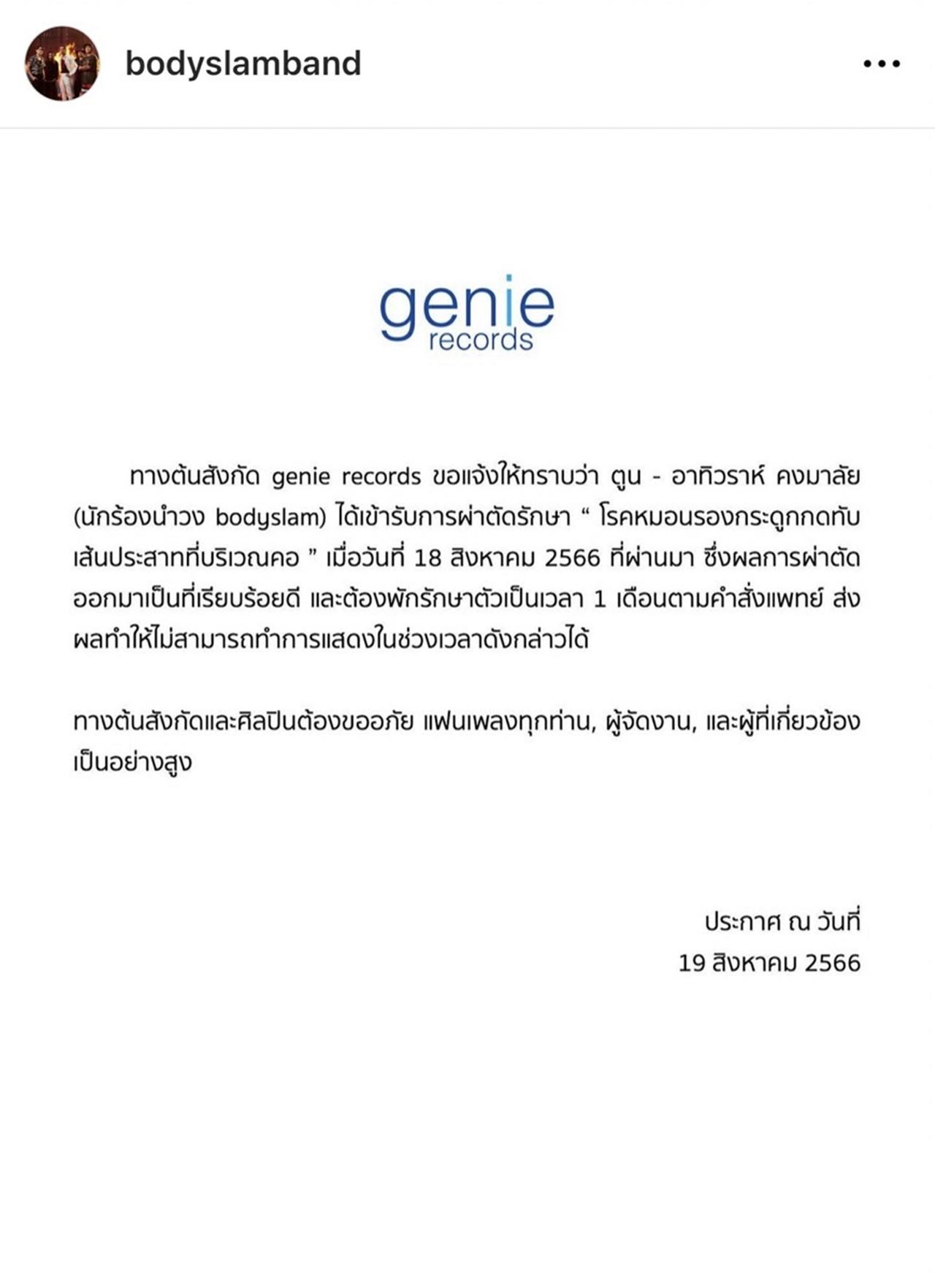 "ทางต้นสังกัด genie records ขอแจ้งให้ทราบว่า ตูน - อาทิวราห์ คงมาลัย (นักร้องนำวง bodyslam) ได้เข้ารับการผ่าตัดรักษา “โรคหมอนรองกระดูกกดทับเส้นประสาทที่บริเวณคอ” เมื่อวันที่ 18 สิงหาคม 2566 ที่ผ่านมา ซึ่งผลการผ่าตัดออกมาเป็นที่เรียบร้อยดี และต้องพักรักษาตัวเป็นเวลา 1 เดือนตามคำสั่งแพทย์