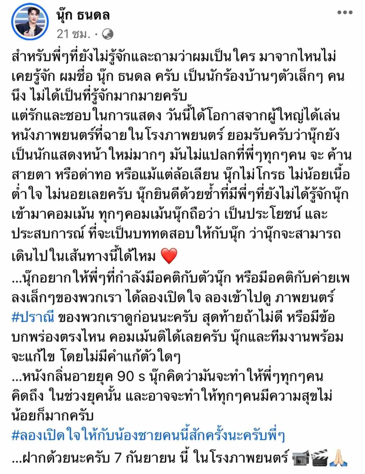 ไม่รู้ว่าเกิดอะไรขึ้น ถึงทำให้นักร้องหนุ่มชื่อดัง นุ๊ก ธนดล ศิริแวว ถึงได้ออกมาโพสต์ข้อความลงในเฟซบุ๊กส่วนตัวของตัวเอง โดยนุ๊กได้เขียนข้อความที่ทำเอาแฟนๆ ของนักร้องหนุ่มอ่านแล้วต้องรีบเข้ามาคอมเมนต์เพื่อซัพพอร์ตความรู้สึกของนักร้องที่ตัวเองชื่นชอบอย่างมากมาย ซึ่งมีข้อความว่า