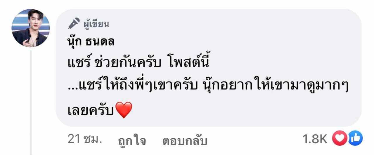 พร้อมกับคอมเมนต์ใต้โพสต์ดังกล่าวว่า "แชร์ ช่วยกันครับ โพสต์นี้…แชร์ให้ถึงพี่ๆ เขาครับ นุ๊กอยากให้เขามาดูมากๆ เลยครับ"