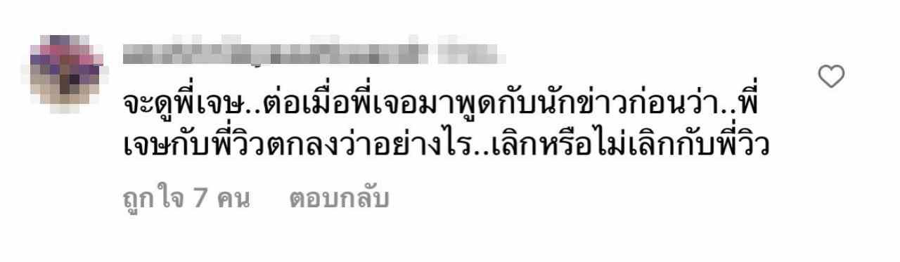 "เมื่อไหร่พี่เจษจะออกมาพูดละค่ะ จะได้จบๆๆ กันซะที FC รอคำตอบอยู่ค่ะ มีความสุขดีดกีต้าร้องเพลงคู่ด้วย หวานขนาดนี้น่าจะเป็นแฟนแน่ๆๆ จร้า, อยากให้ละครจบไวๆ อยากรู้เลิกไม่เลิก สงสารพี่วิว, ไม่ดูละครค่ะ โปรโมทขนาดนี้ แบบไม่สนใจวิว, กลับไปดูแลนางเอกในชีวิตจริงบ้างนะคะ, เจษนะเจษ แล้ววิวล่ะ, สงสารวิวจัง, น่าสงสัย ลงคลิปพี่วิวบ้าง, ห่วงความรู้สึกแฟนด้วยนะคะ, พี่เจษลงรูปกับพี่วิวหน่อยงับบ"