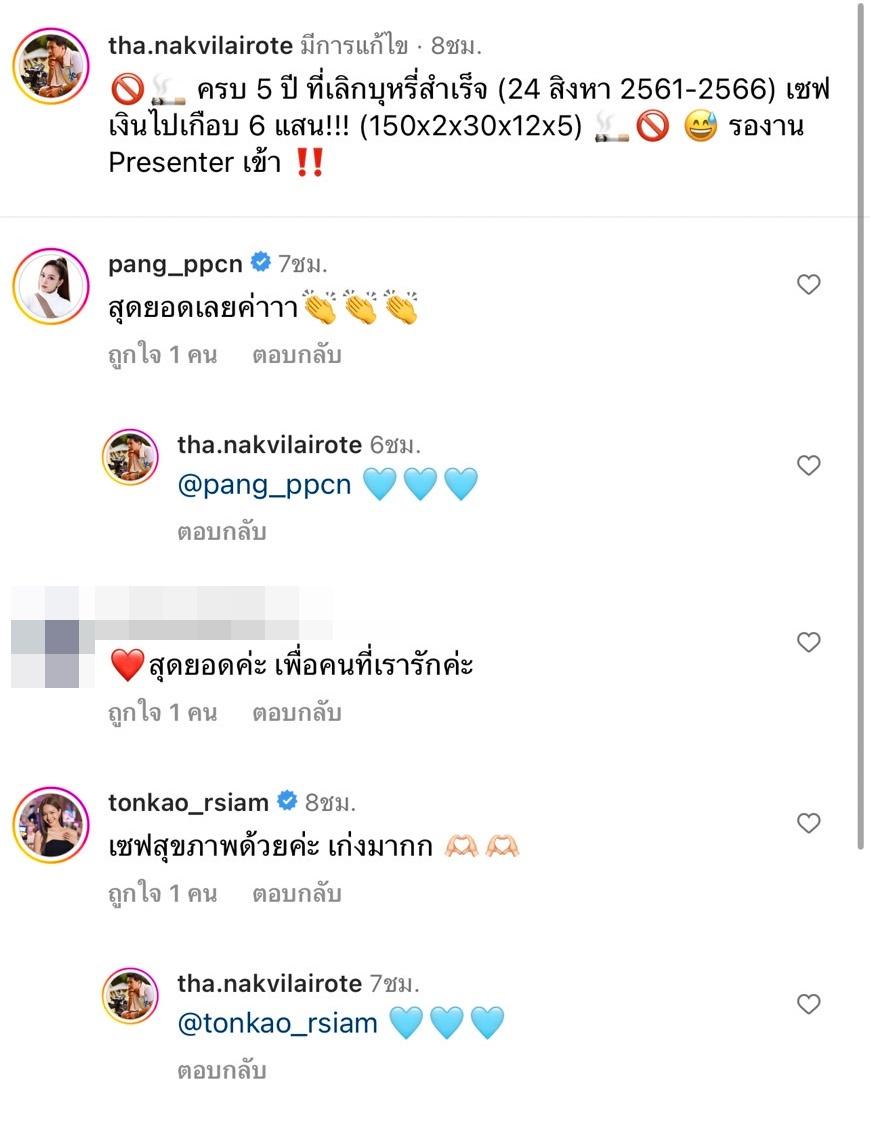 ซึ่งผู้จัดละคร-นักแสดงหนุ่ม ถา สถาพร นาควิไลโรจน์ ก็เป็นหนึ่งในคนที่เคยสูบบุหรี่ จนตอนนี้สามารถเลิกสูบบุหรี่มาได้ 5 ปีแล้ว และเจ้าตัวโพสต์ภาพตัวเองพร้อมทั้งเขียนข้อความว่า “ครบ 5 ปี ที่เลิกบุหรี่สำเร็จ (24 สิงหา 2561-2566) เซฟเงินไปเกือบ 6 แสน!!! (150x2x30x12x5) รองาน Presenter เข้า”