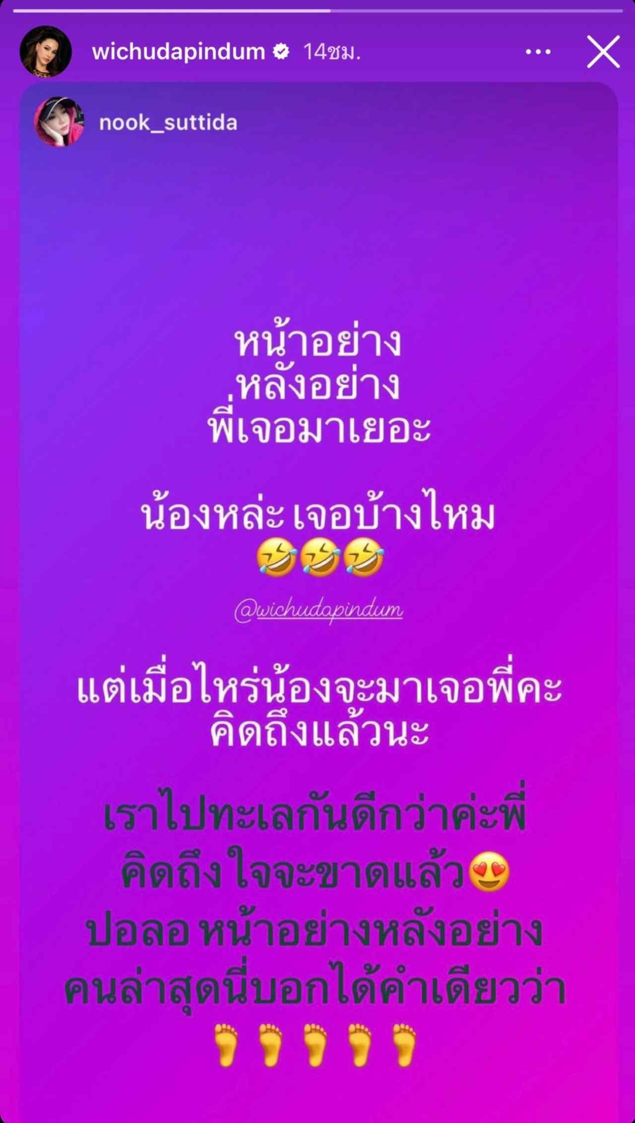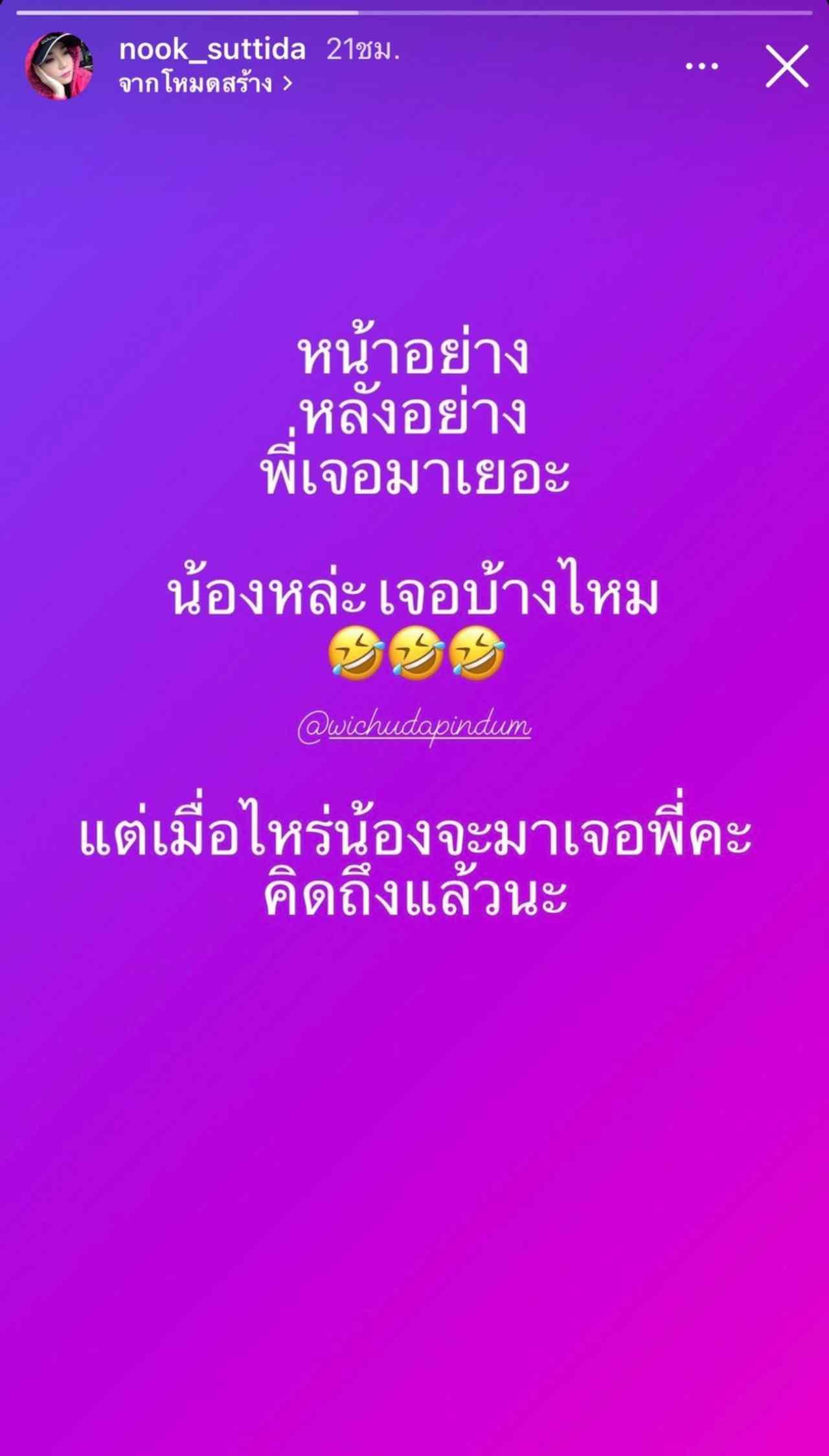 โดย นุ๊ก สุทธิดา ได้โพสต์ข้อความผ่านทางไอจีสตอรี่ของตัวเองซึ่งมีข้อความที่เขียนว่า "หน้าอย่าง หลังอย่าง พี่เจอมาเยอะ น้องหล่ะ เจอบ้างไหม @wichudapindum แต่เมื่อไรน้องจะมาเจอพี่คะ คิดถึงแล้วนะ"
