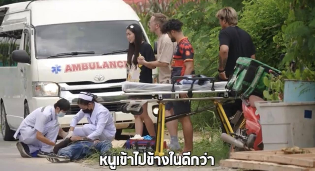 และเมื่อรถพยาบาลมาถึง พยาบาลก็เข้ามาหาคนเจ็บและถามว่าเป็นอย่างไร เจ็บตรงไหน เมื่อคนเจ็บบอกว่าที่ขาก็เริ่มทำการปฐมพยาบาล และด้วยสถานการณ์ที่เริ่มเครียดขึ้นเรื่อยๆ เอวาถามเสียงเครียดว่าจะโอเคไหน ด้านเนทก็บอกว่า “เอวา เข้าไปข้างในก่อนไหม”