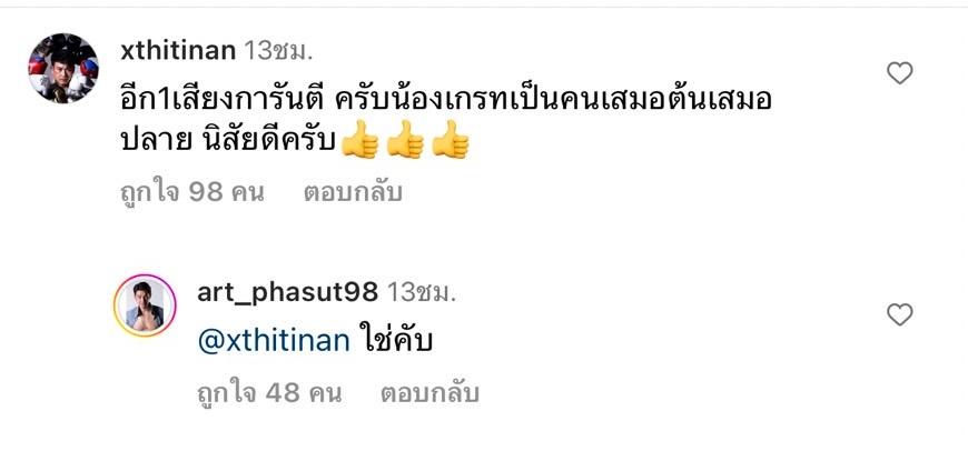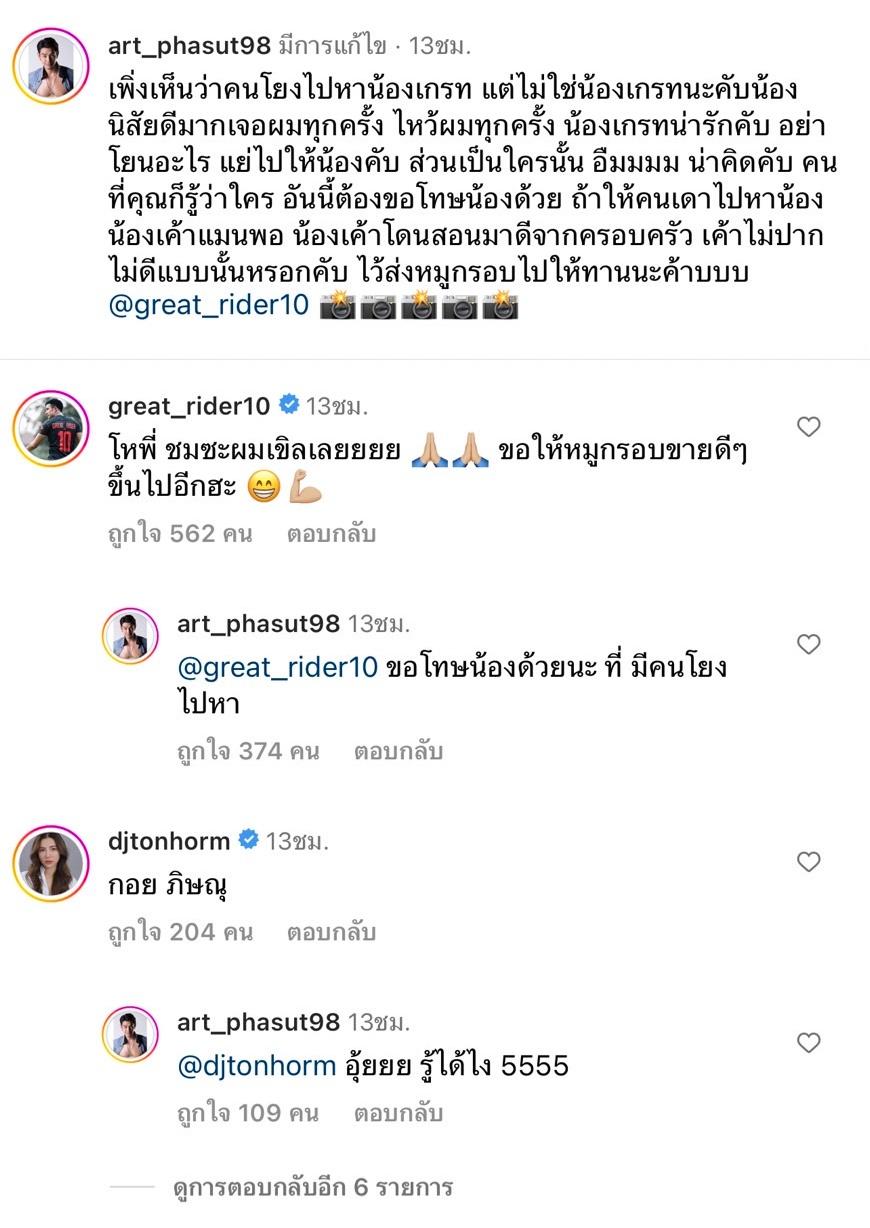 ล่าสุด อาร์ต พศุตม์ โพสต์คลิปสัมภาษณ์ของ เกรท วรินทร พร้อมทั้งชี้แจงว่า “เพิ่งเห็นว่าคนโยงไปหาน้องเกรท แต่ไม่ใช่น้องเกรทนะคับ น้องนิสัยดีมาก เจอผมทุกครั้งไหว้ผมทุกครั้ง น้องเกรทน่ารักคับ อย่าโยนอะไรแย่ไปให้น้องคับ ส่วนเป็นใครนั้น อืมมมม น่าคิดคับ คนที่คุณก็รู้ว่าใคร อันนี้ต้องขอโทษน้องด้วย ถ้าให้คนเดาไปหาน้อง น้องเค้าแมนพอ น้องเค้าโดนสอนมาดีจากครอบครัว เค้าไม่ปากไม่ดีแบบนั้นหรอกคับ ไว้ส่งหมูกรอบไปให้ทานนะค้าบบบ @great_rider10”