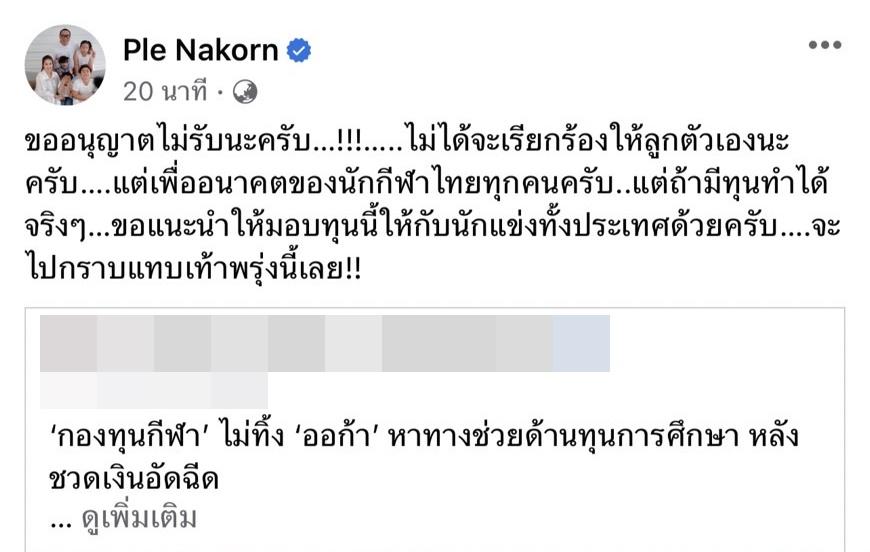 อีกทั้งยังแชร์ข่าวที่บอกว่า “กองทุนกีฬาไม่ทิ้งออก้า หาทางช่วยด้านทุนการศึกษา หลังชวดเงินอัดฉีด” พร้อมทั้งเขียนข้อความว่า “ขออนุญาตไม่รับนะครับ…!!!…..ไม่ได้จะเรียกร้องให้ลูกตัวเองนะครับ….แต่เพื่ออนาคตของนักกีฬาไทยทุกคนครับ..แต่ถ้ามีทุนทำได้จริงๆ…ขอแนะนำให้มอบทุนนี้ให้กับนักแข่งทั้งประเทศด้วยครับ….จะไปกราบแทบเท้าพรุ่งนี้เลย!!”.