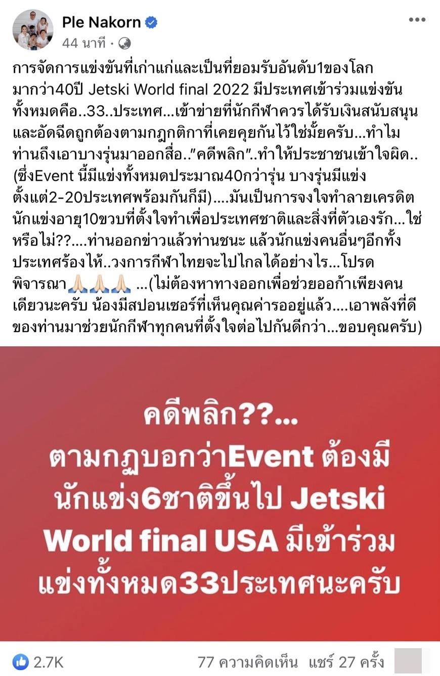 ล่าสุด เปิ้ล นาคร ก็ได้โพสต์ภาพข้อความที่เขียนว่า “คดีพลิก??... ตามกฎบอกว่า Event ต้องมีนักแข่ง 6 ชาติขึ้นไป Jetski World Final USA มีเข้าร่วมแข่งทั้งหมด 33 ประเทศนะครับ” พร้อมทั้งเขียนข้อความว่า “การจัดการแข่งขันที่เก่าแก่และเป็นที่ยอมรับอันดับ 1 ของโลกมากว่า 40 ปี Jetski World final 2022 มีประเทศเข้าร่วมแข่งขันทั้งหมดคือ..33..ประเทศ…เข้าข่ายที่นักกีฬาควรได้รับเงินสนับสนุนและอัดฉีดถูกต้องตามกฎกติกาที่เคยคุยกันไว้ใช่มั้ยครับ…