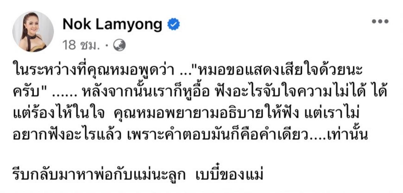 ควรให้กำลังใจกันไหม ไม่ใช่เอาเรื่องความทุกข์คนอื่นมาเป็นเรื่องความสุข ลำยองไม่โอเคค่ะ แล้วมีหลายคนคอมเมนต์บอกว่า จะเอามาลงเพื่อ กูจำเป็นต้องรู้ด้วยเหรอ แล้วมึงจะร้องไห้ทำไม อะไรแบบเนี่ย ลำยองสูญเสียลูกค่ะ พวกคุณไม่รู้หรอกหัวอกคนเป็นแม่อยากมีลูก ตั้งแต่ปี 62 ค่ะ ที่เริ่มปฏิบัติการมีลูก ปรึกษาหมอเอายามากินตลอด แต่ช่วงนั้นลำยองมีเนื้องอกในมดลูก เลยทำให้มีลูกไม่ได้ เลยผ่าตัดเนื้องอกไปแล้ว มดลูกสะอาดแล้ว มีลูกได้ ก็เป็นความรอคอยมาทั้งชีวิต