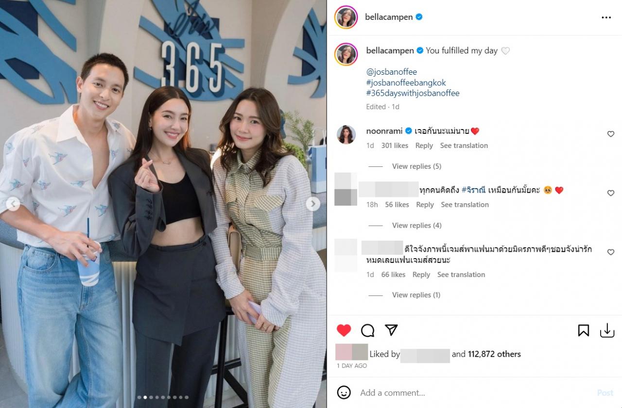 ท่ามกลางคอมเมนต์จากแฟนๆ มากมาย อาทิ ทุกคนคิดถึง #จิราณี เหมือนกันมั้ยคะ, ดีใจจัง ภาพนี้เจมส์พาแฟนมาด้วย มิตรภาพดีๆ ชอบจัง น่ารักหมดเลยแฟนเจมส์สวยนะ, พี่เจมส์มาหาพี่เบลด้วย, ขอจิราณีสักเรื่องนะคะ คิดถึงมาก อยากดูละครที่ทั้งคู่เล่นคู่กันอีก วนดูคุณชายหมอกับปดิวรัดาจนท่องบทได้แล้วค่ะ, อุ๊ย เจมส์จิและโฟม น่ารักๆ ค่ะ, อยากเห็น เบลล่า & เจมส์จิ เล่นละคร ด้วยกันอีกค่าา ฯลฯ.