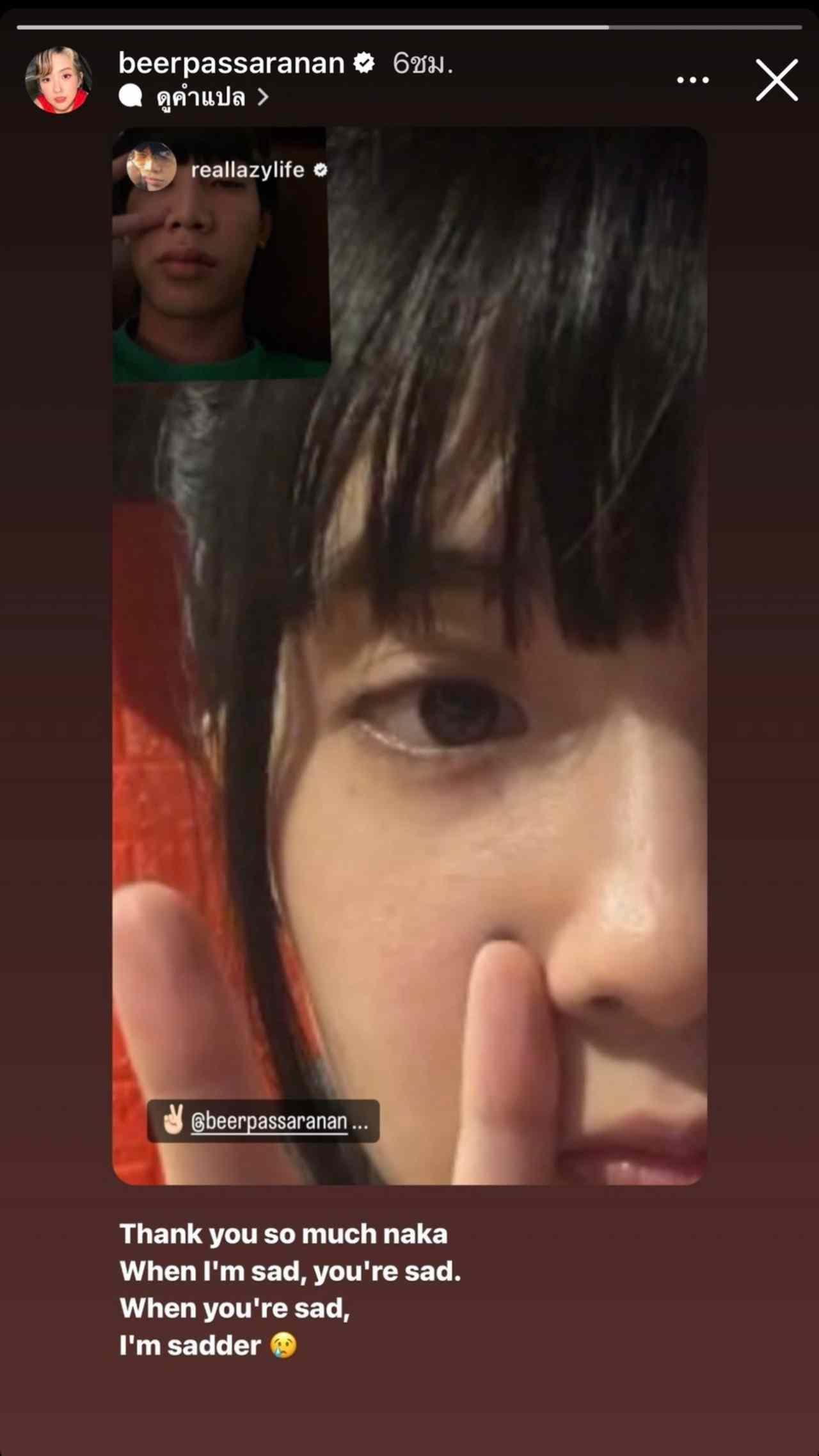 "Thank you so much naka Whem I'm sad, you're sad. When you're sad, I'm sadder" (ขอบคุณมากนะคะ เมื่อฉันเศร้า คุณก็เศร้า เมื่อคุณเศร้า ฉันก็เศร้ามากขึ้น) พร้อมอีโมจิรูปหน้าเศร้า